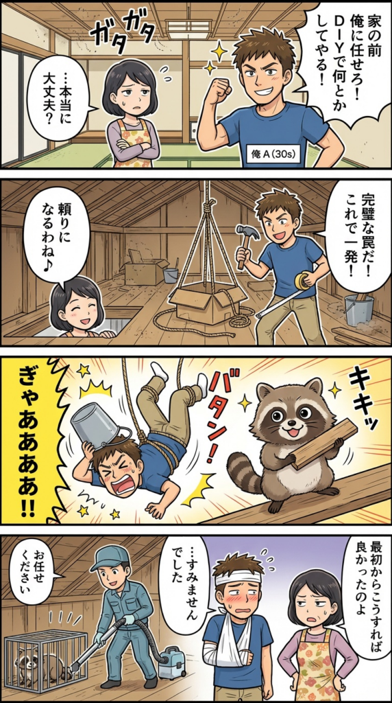 「アライグマ駆除って自分でできないの?」と思う方もいるかもしれません。結論から言うと、素人のDIY駆除は絶対におすすめしません。