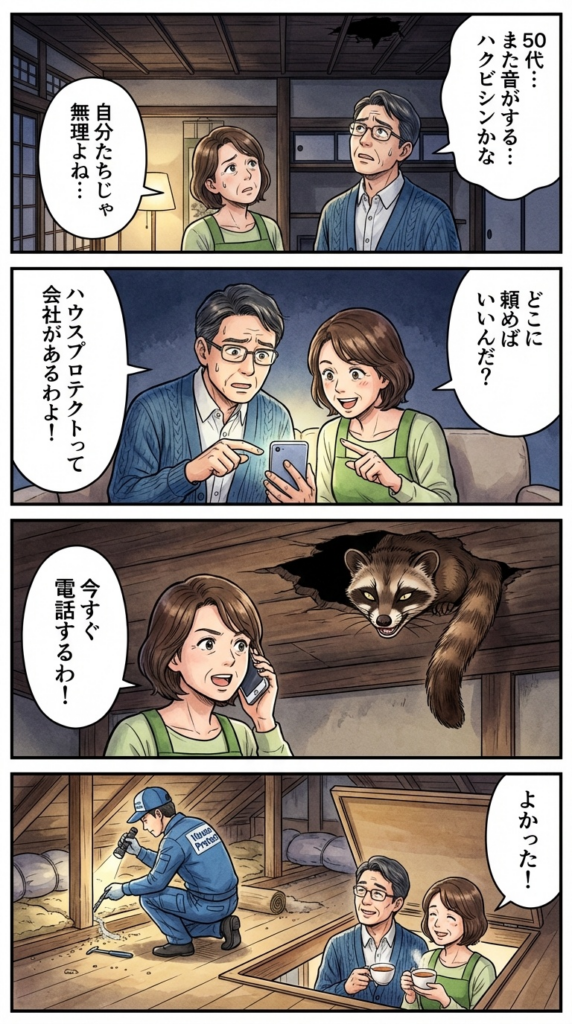 専門業者に依頼したところ、足跡試薬を散布してハクビシンと特定。スタッフ4名体制で4日間かけて全侵入口を封鎖し、天井裏の清掃と殺虫消毒作業を実施。業界最長5年間の侵入保証もついたため、Bさんは安心して暮らせるようになったそうです。(出典:害獣駆除専門ASWAT公式ブログ)