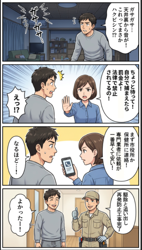 忌避剤や追い出しだけでは、侵入口を塞がない限り再侵入されます。追い払った後は必ず侵入経路を封鎖し、餌になるものを片付けることが重要です。