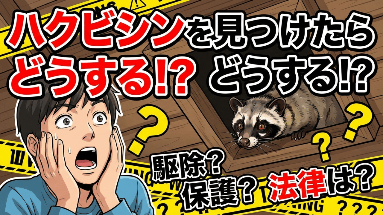 💡 ハクビシンを見つけたら、絶対に自分で捕獲・駆除してはいけません。鳥獣保護管理法で保護されている動物のため、無許可での捕獲は違法行為となり、1年以下の懲役または100万円以下の罰金が科される可能性があります。