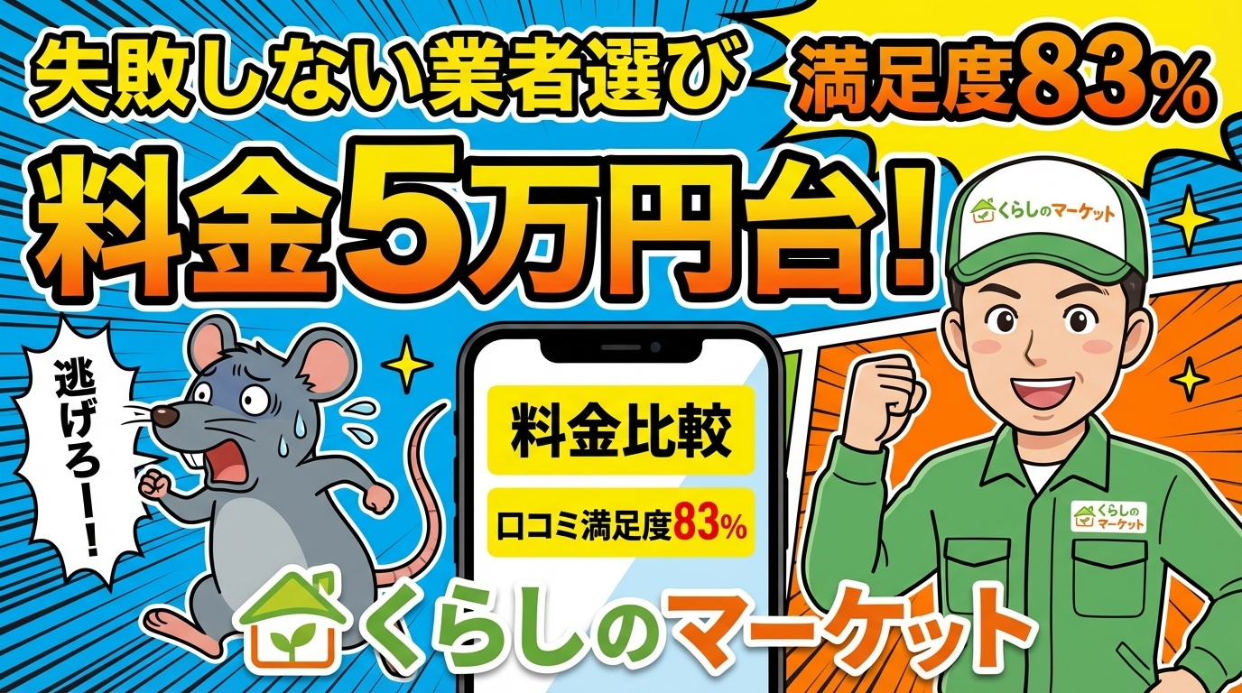 この記事では、くらしのマーケットでネズミ駆除を依頼する際の料金相場・口コミ・評判・メリット・デメリット・優良業者の選び方を徹底解説します!