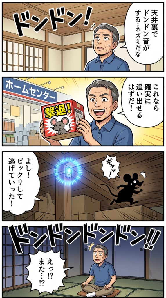 東京都在住の30代・築15年の戸建てにお住まいのAさんは、夜になるとネズミの足音に悩まされていました。小さなお子様がいるため毒餌は使えず、安全なLEDライト駆除器を試してみることにしたそうです。