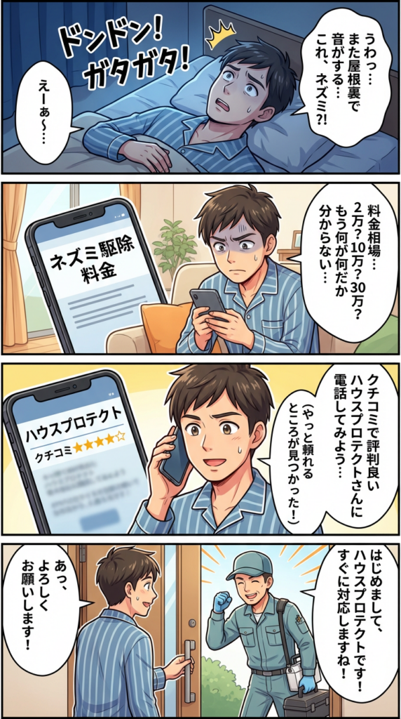 東京都在住の40代・築20年の一戸建てにお住まいのAさんの事例。天井裏から聞こえる不気味な足音に悩まされ、ネズミ駆除業者への依頼を検討していました。しかし、インターネットで調べても「2万円〜」「10万円以上」など幅広い料金表示ばかりで、実際にいくら必要なのか全く見当がつかない状態でした。
