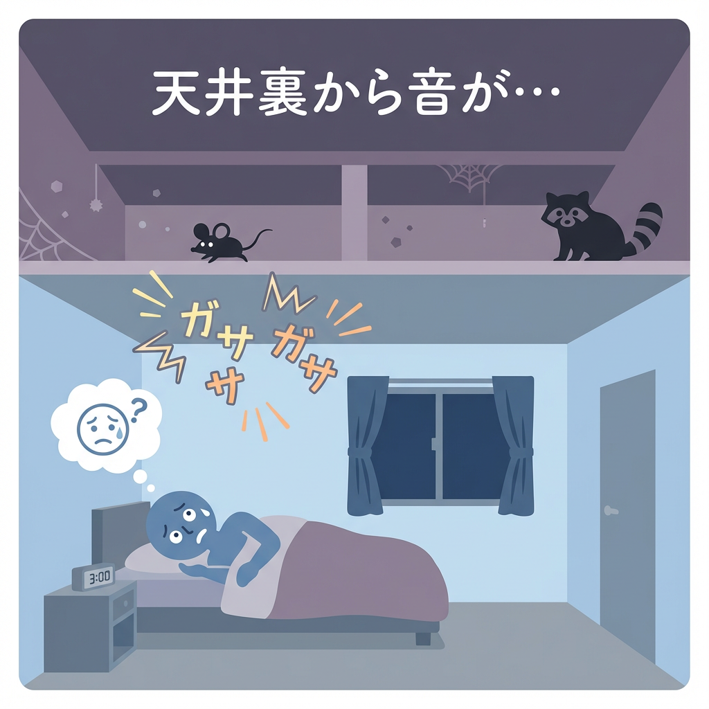東京都在住の30代・築20年の木造アパートにお住まいのAさんは、深夜に天井裏から聞こえる「ガサガサ」という音に悩まされていました。管理会社に連絡したものの「入居者の責任です」と言われ、駆除費用の負担を巡って困惑していました。