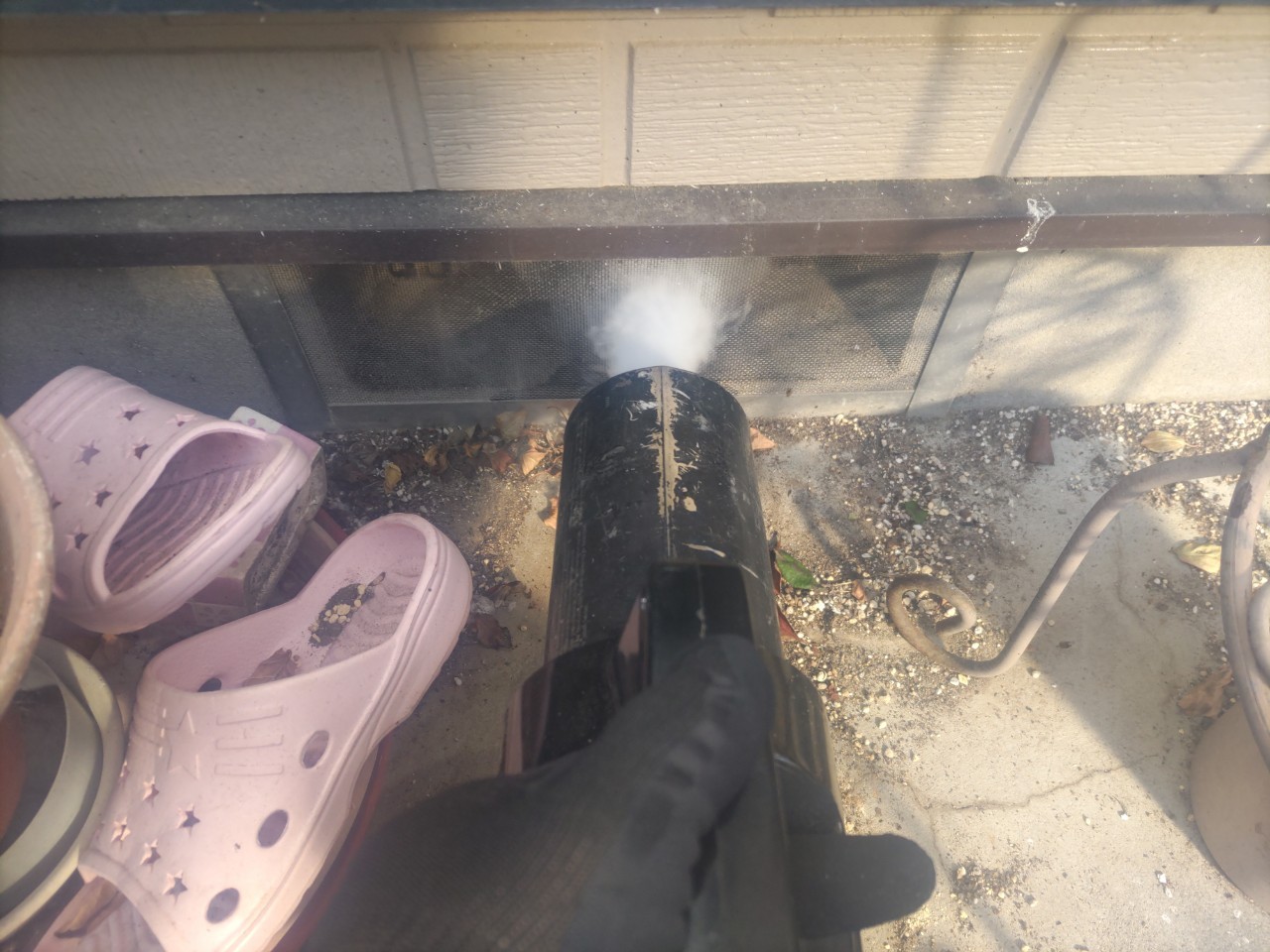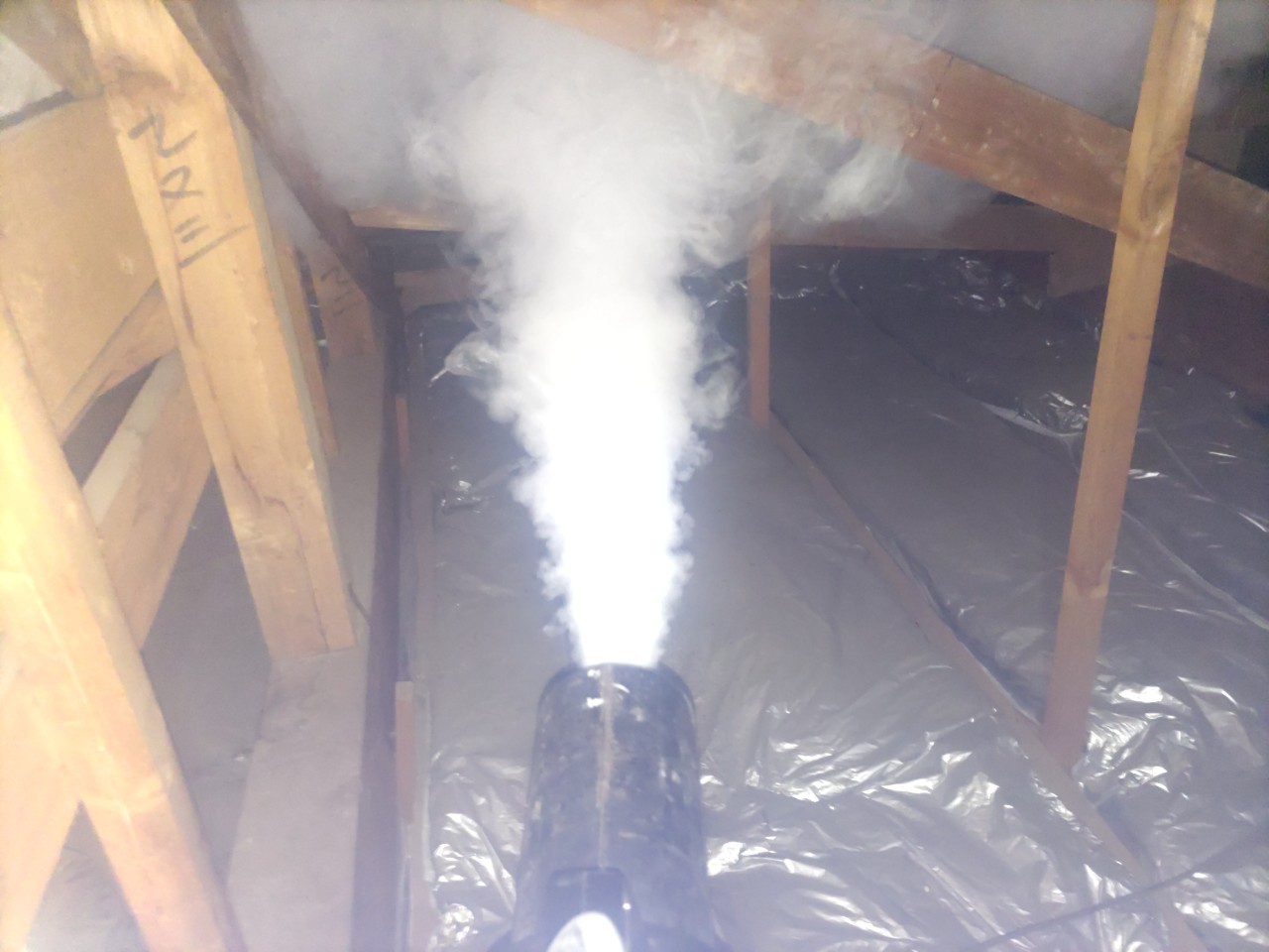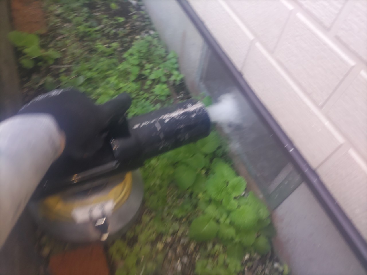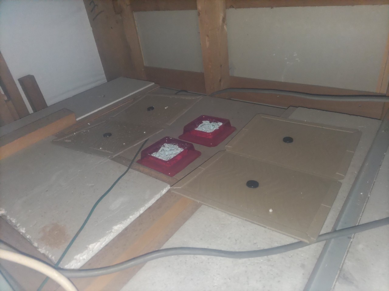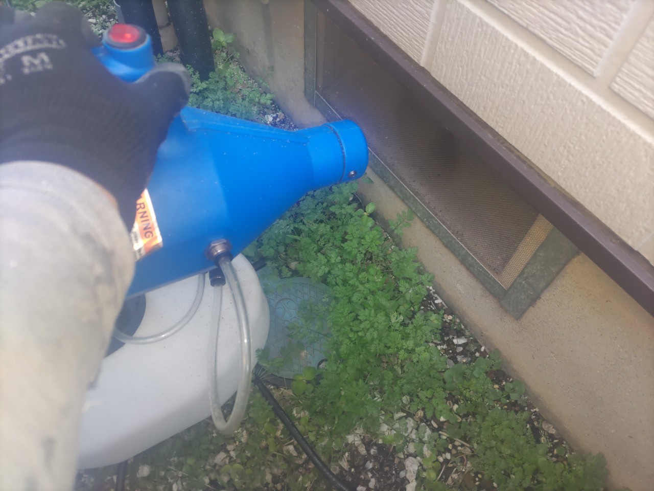 作業の初めに、ネズミの糞清掃や様々な作業を徹底して行えるように点検口を作成し、燻煙剤と呼ばれる薬剤を天井裏や床下に投入することで、ネズミを追い出していきます。