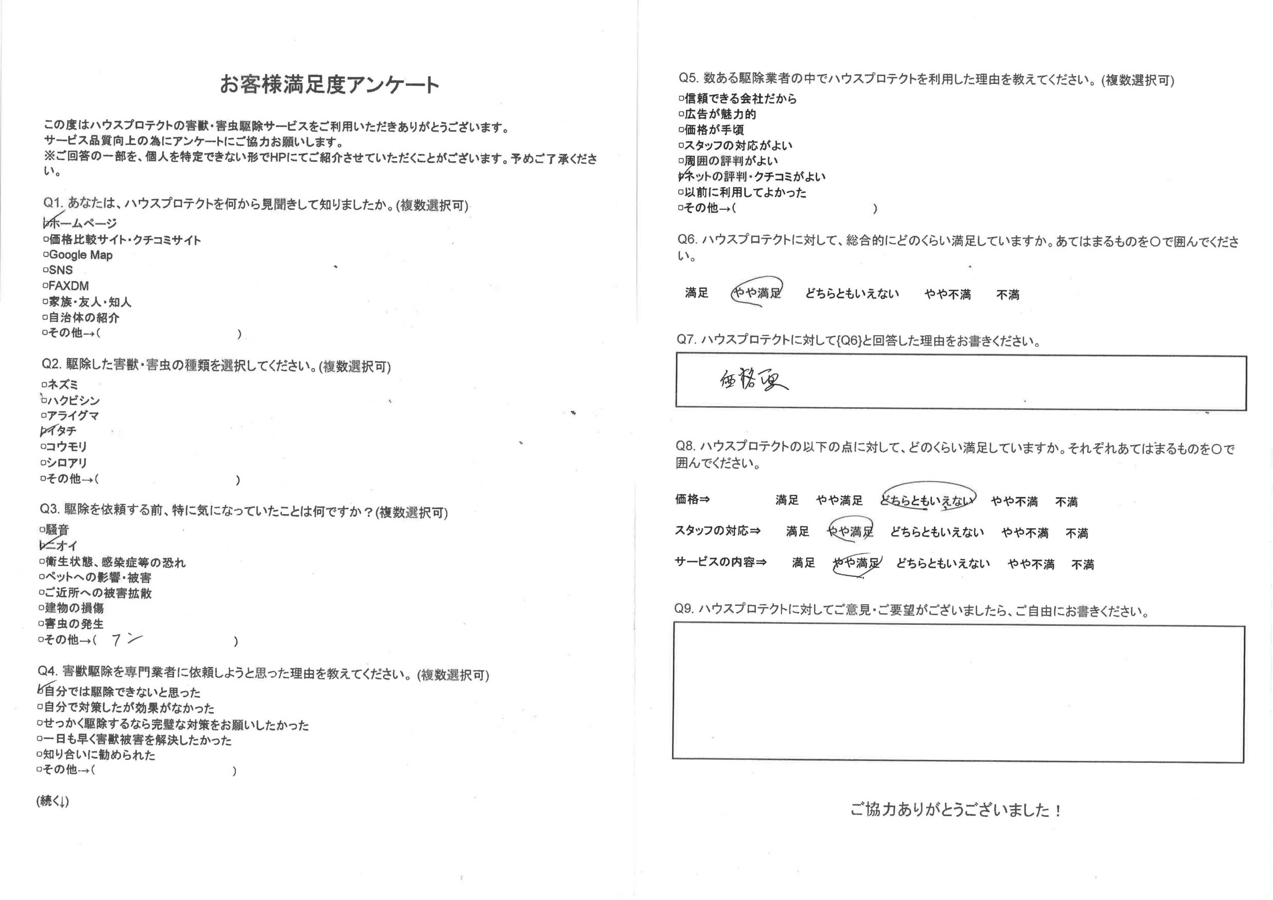 イタチ被害にお困りでいらっしゃったお客様からアンケートのご回答をいただきました。
