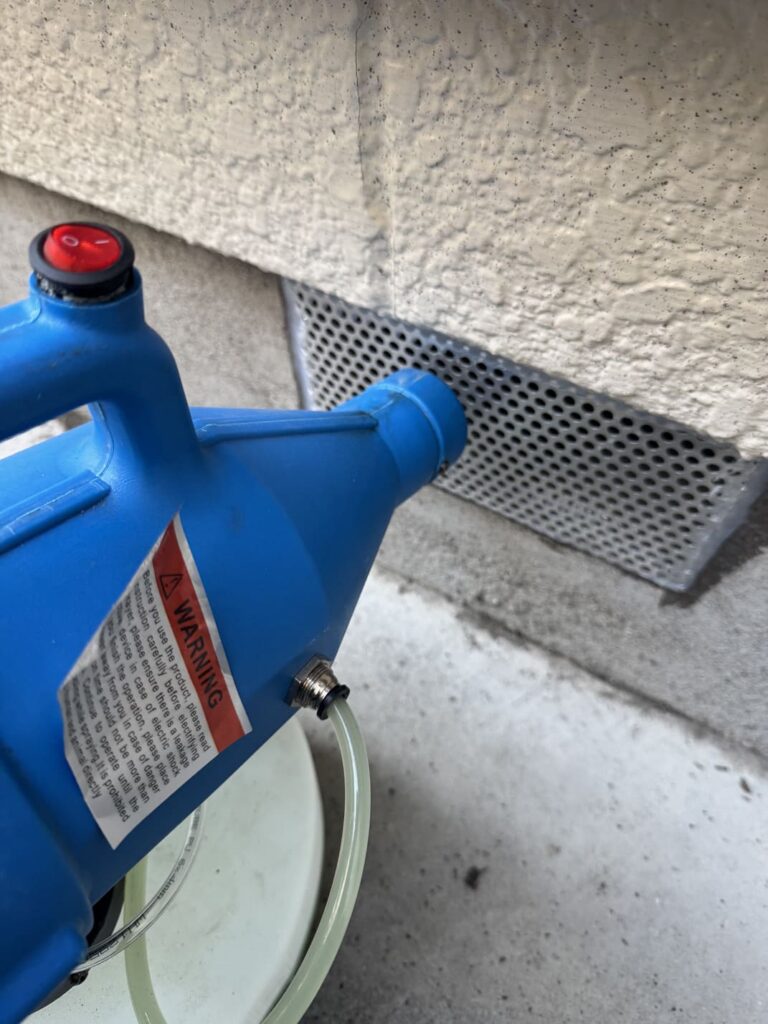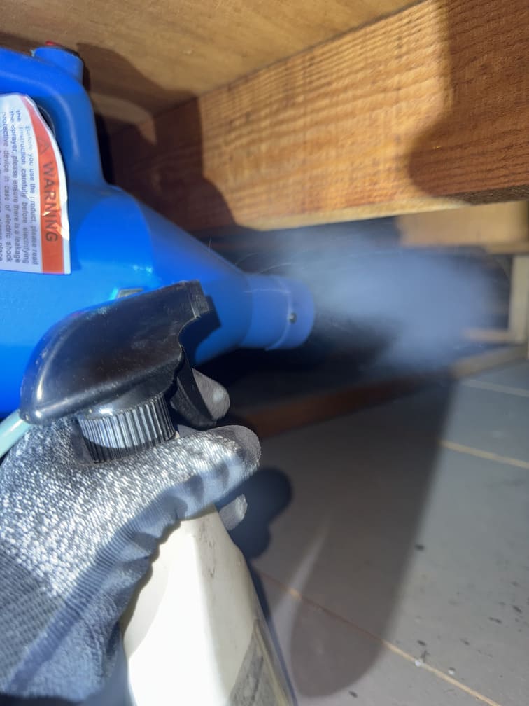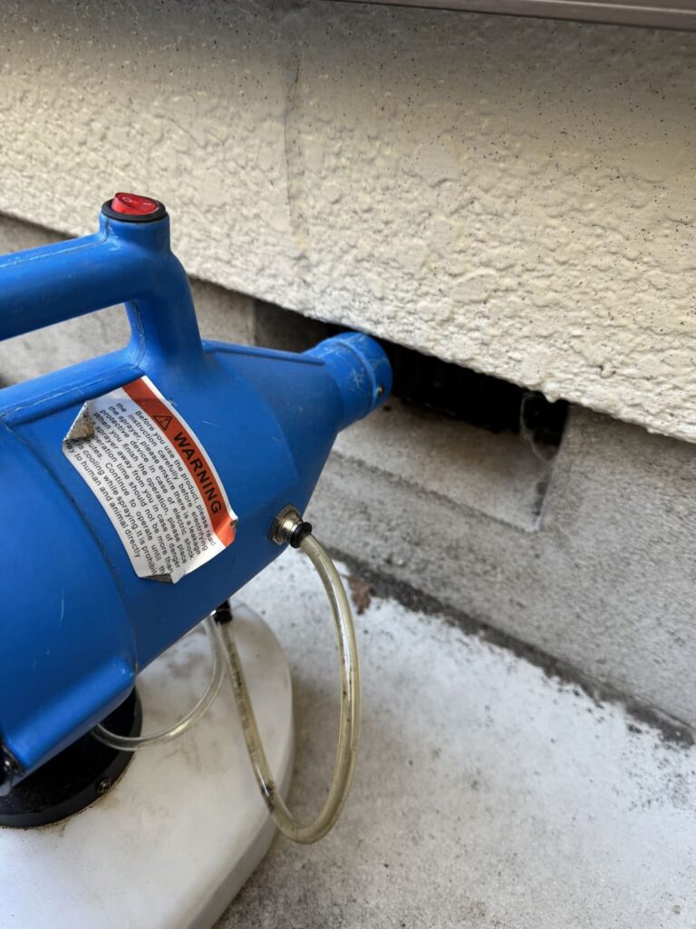 - ①まずは、燻煙剤を使用して床下や天井裏の隅々にまで薬剤を行き渡らせ、潜んでいるネズミを確実に追い出します。
