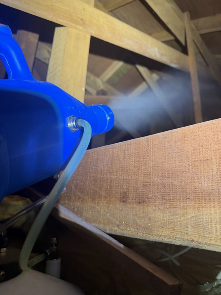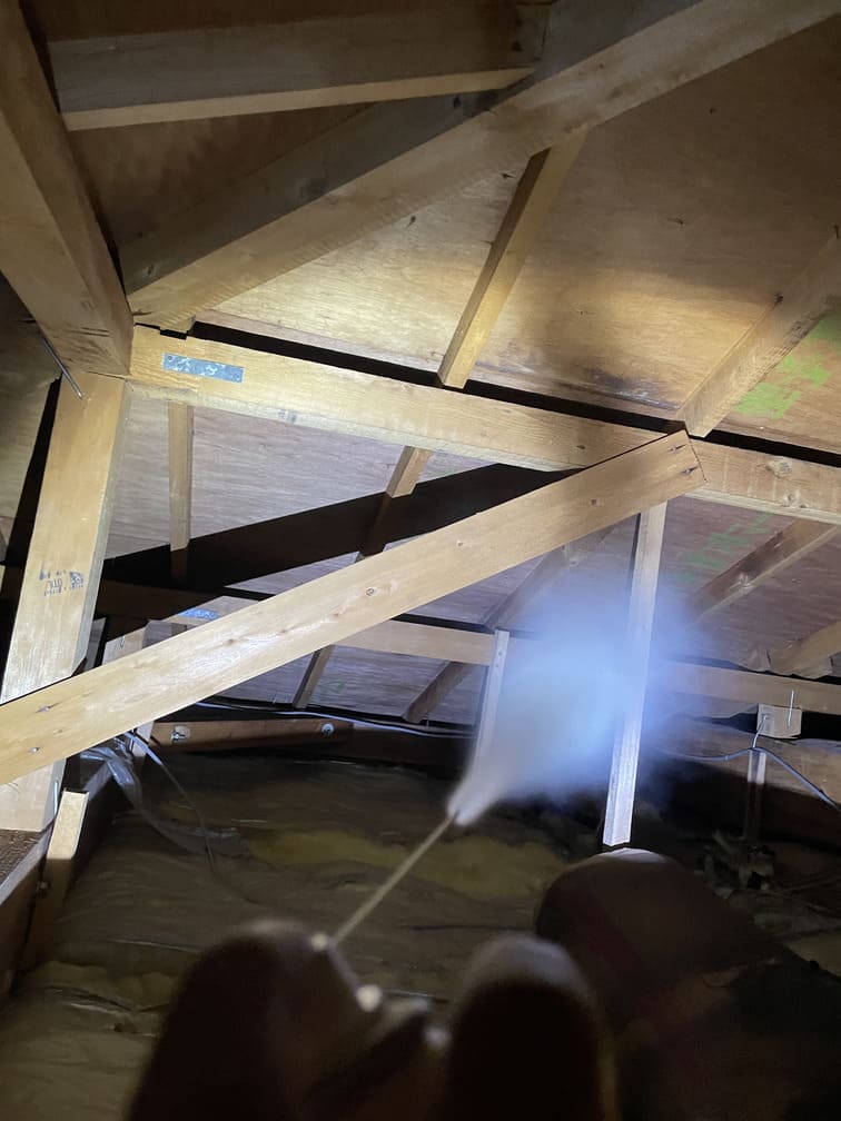 - ①燻煙剤を天井裏や床下に投入し、建物内に潜んでいるイタチを外部へ追い出します。