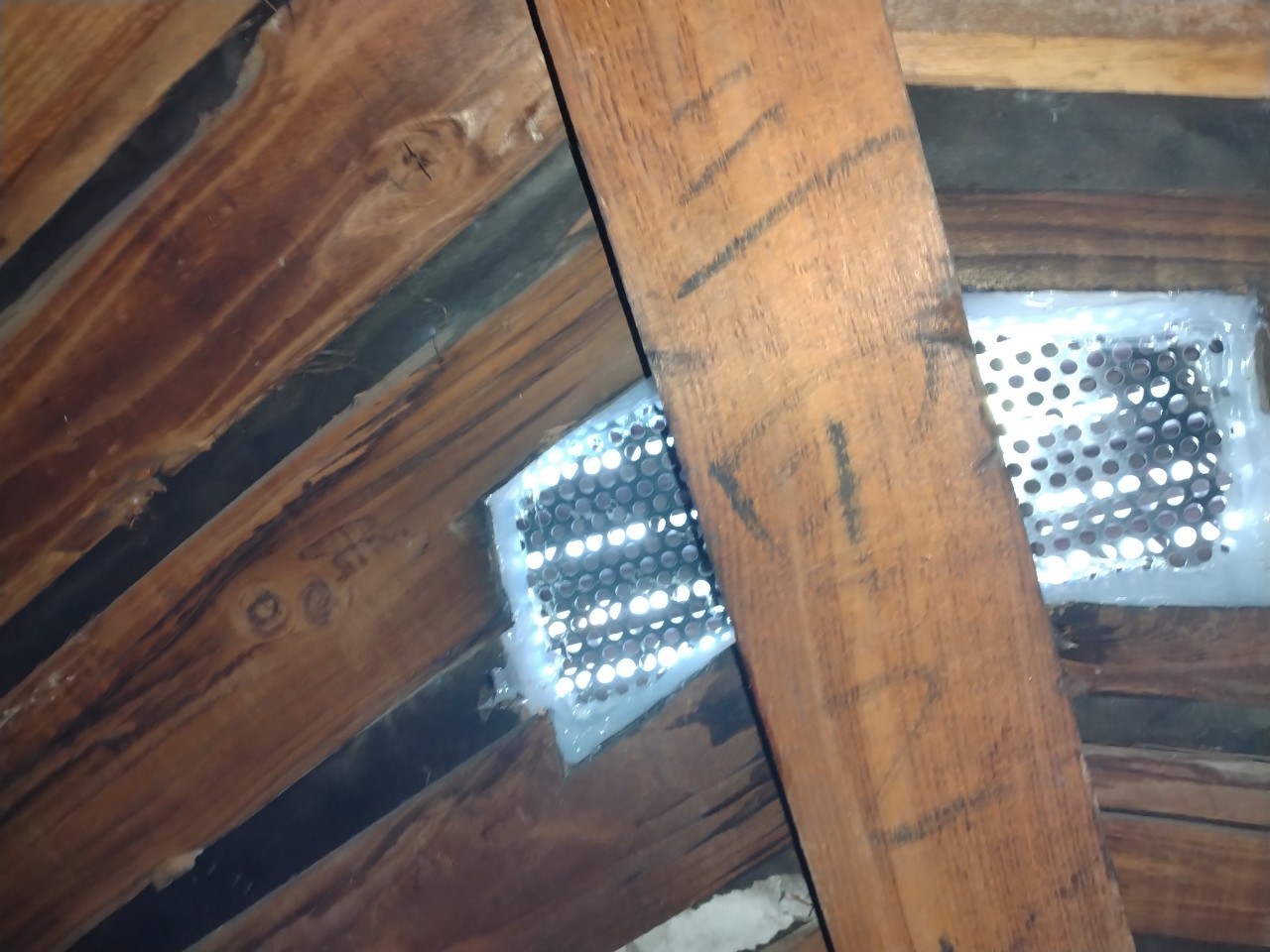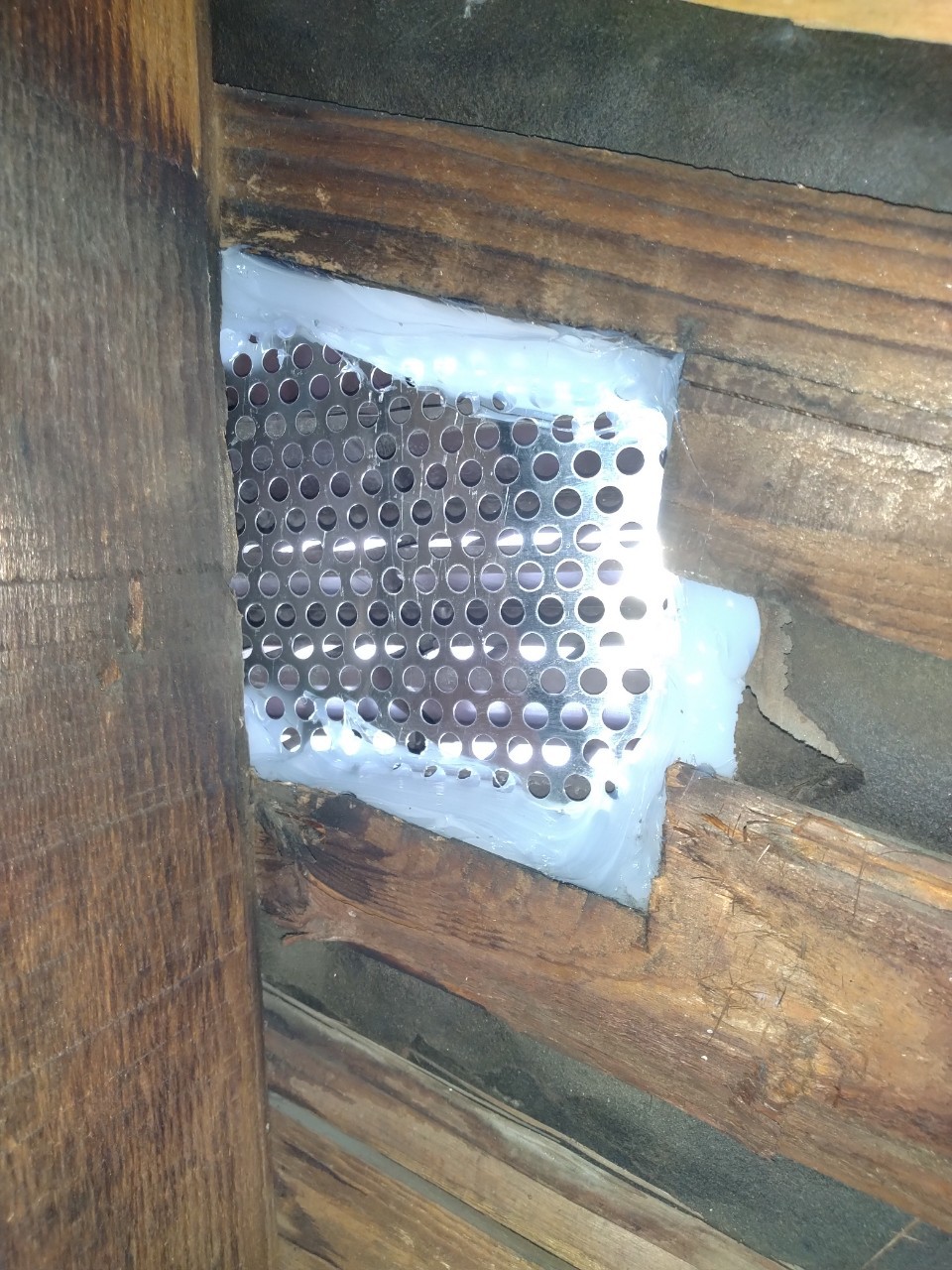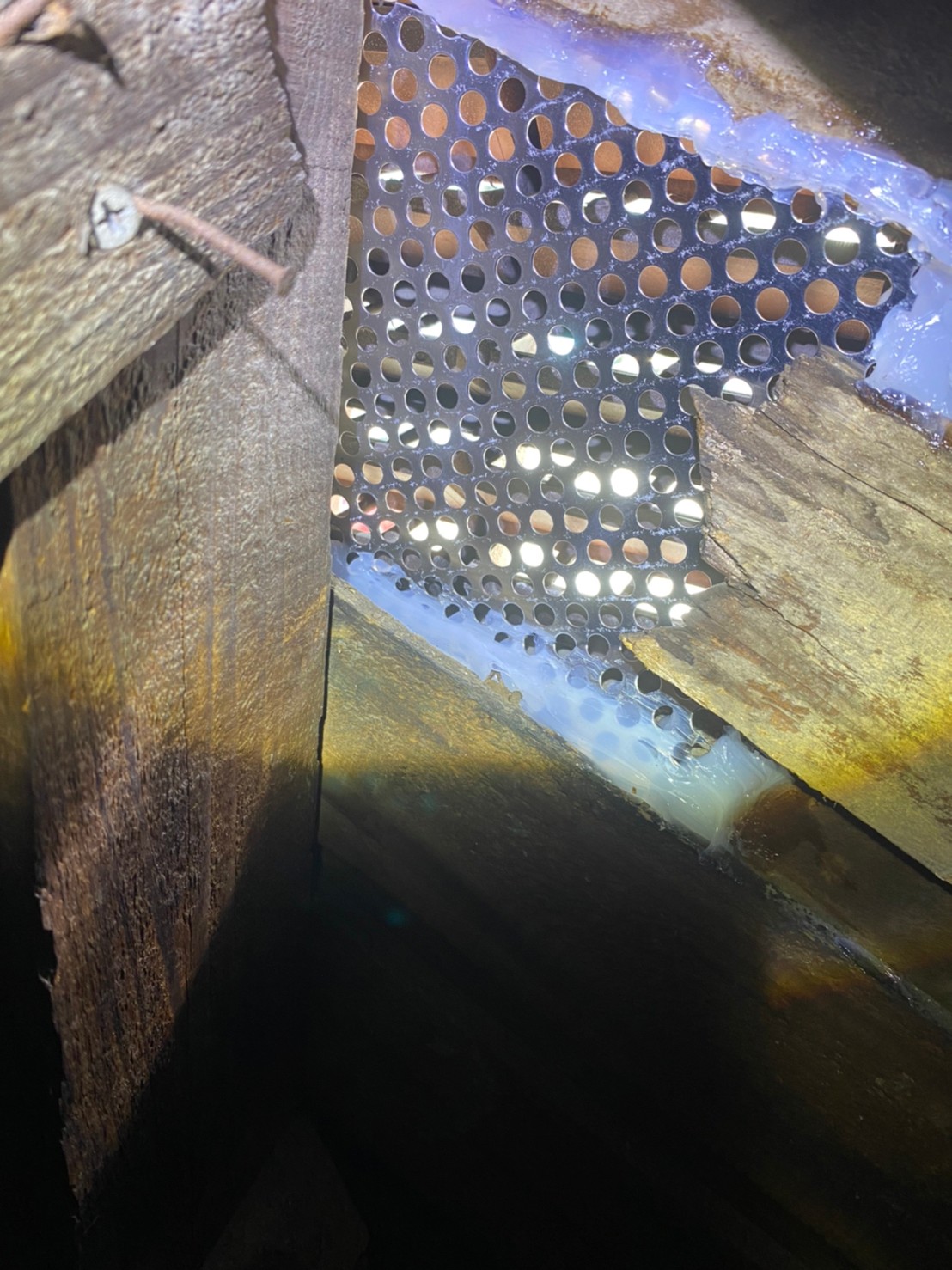続いて、パンチングメタルや金網、コーキング剤などを用いて、あらゆる侵入経路を封鎖していきます。これによりコウモリに限らず、他の害獣の再侵入も防ぐことができます。
