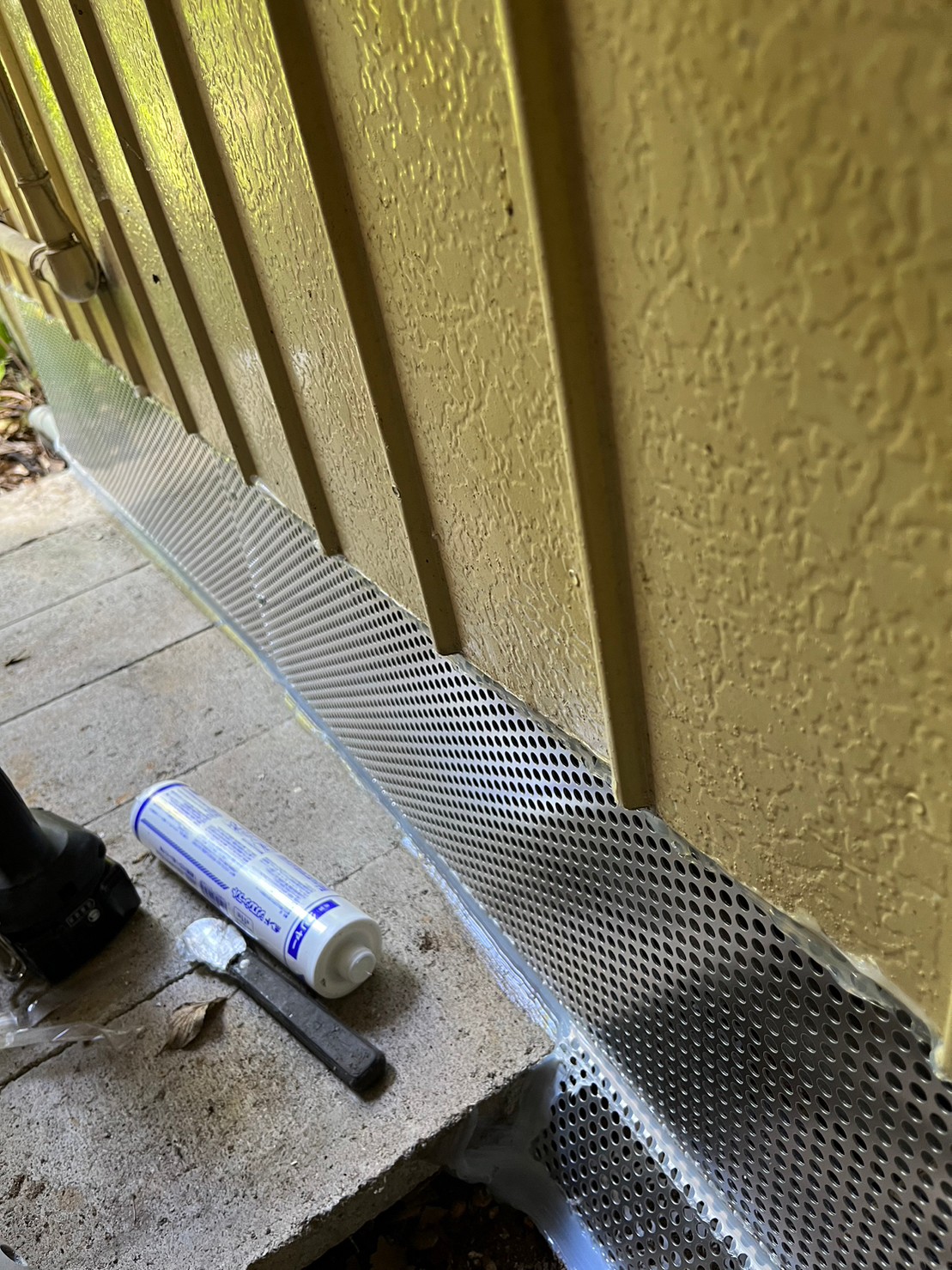 続いて、イタチの再侵入を防ぐために、パンチングメタルや金網、コーキング剤などを用いて侵入経路の封鎖を行います。