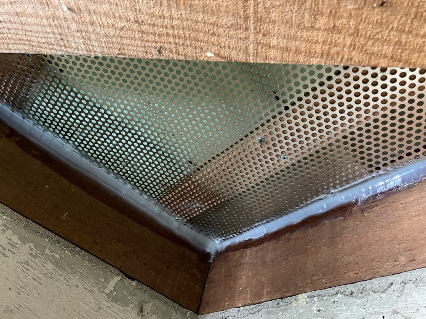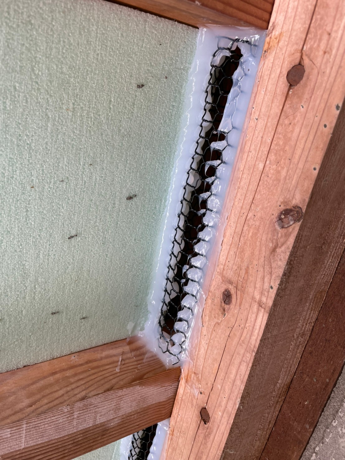 続いて、イタチの再侵入を防ぐために、パンチングメタルや金網、コーキング剤などを用いて侵入経路の封鎖を行います。