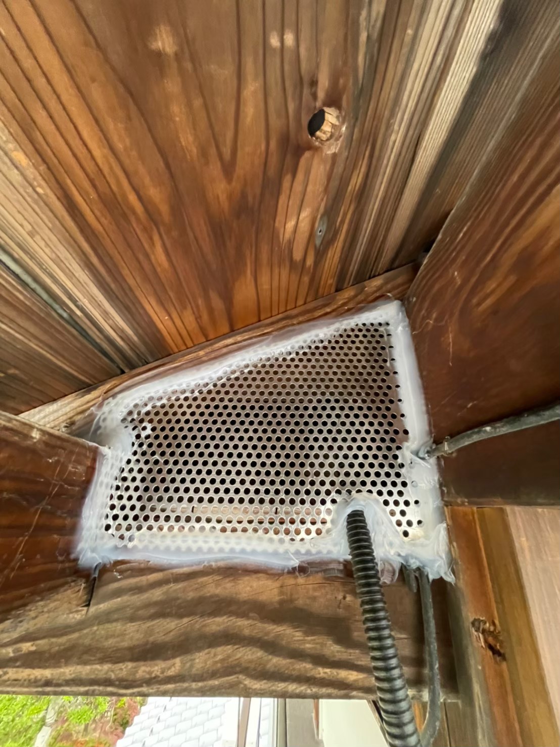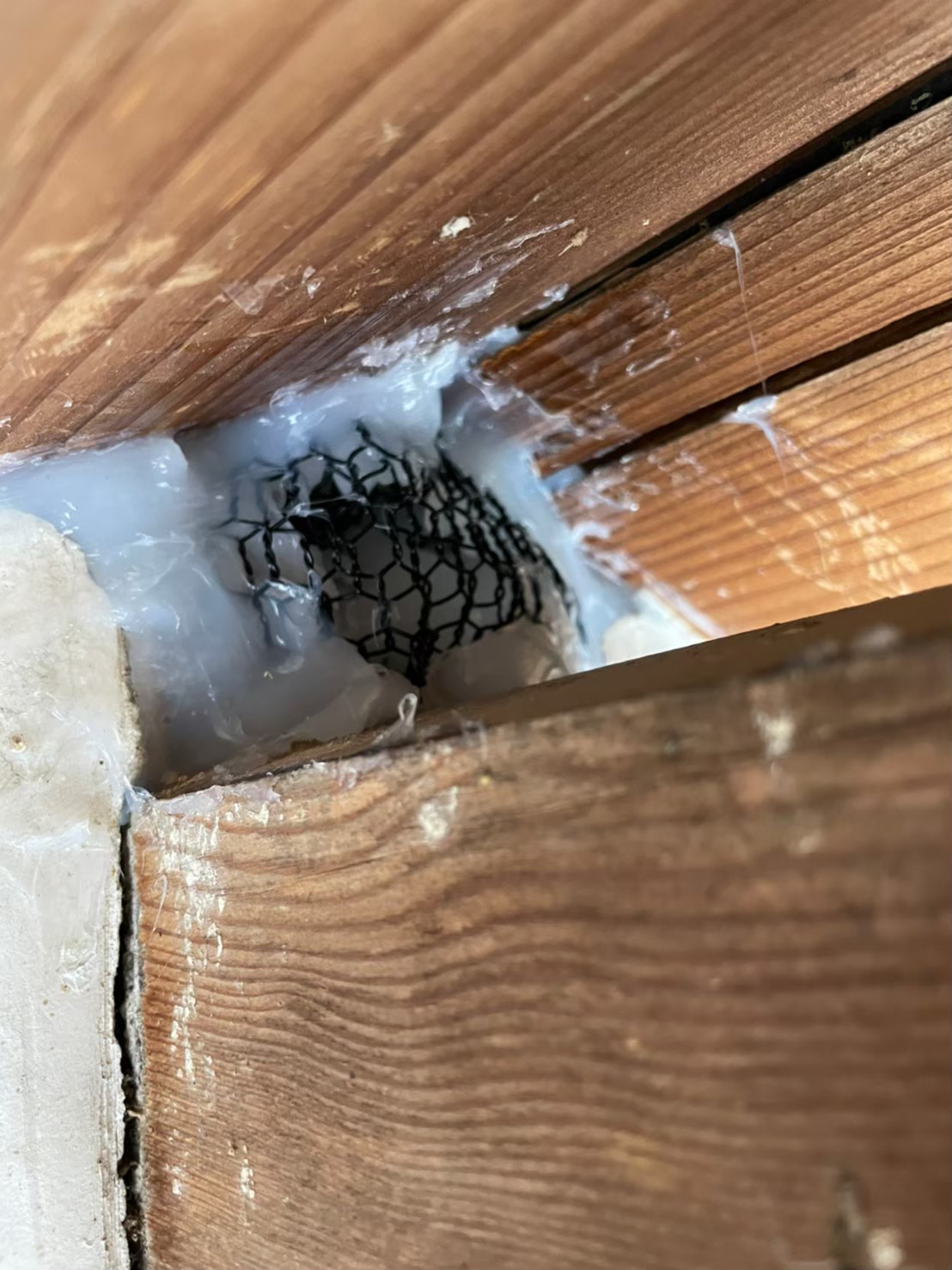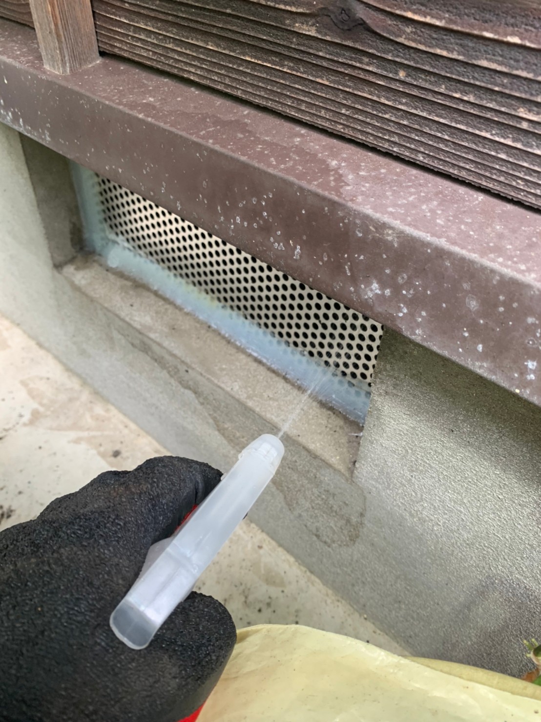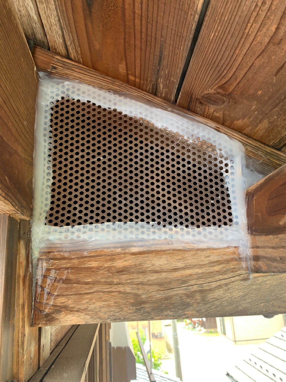 続いて、パンチングメタルや金網、コーキング剤などを用いて、あらゆる侵入経路を封鎖していきます。これによりネズミに限らず、他の害獣の再侵入も防ぐことができます。