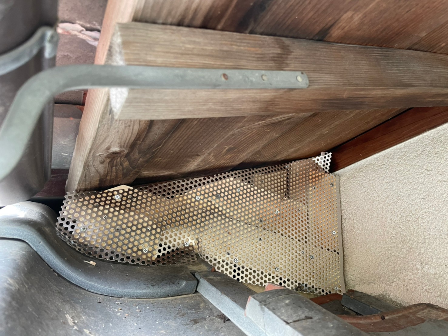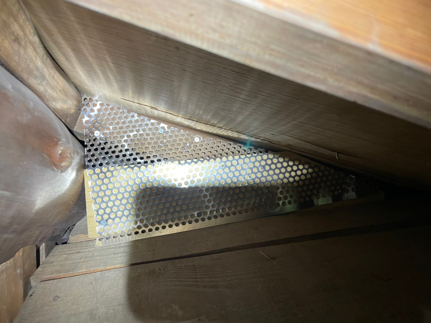 続いて、パンチングメタルや金網、コーキング剤などを用いて、あらゆる侵入経路を封鎖していきます。これによりアライグマに限らず、他の害獣の再侵入も防ぐことができます。