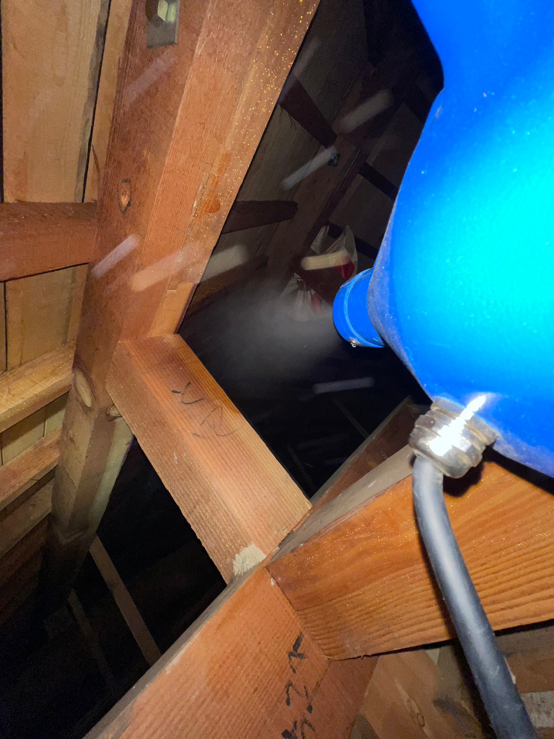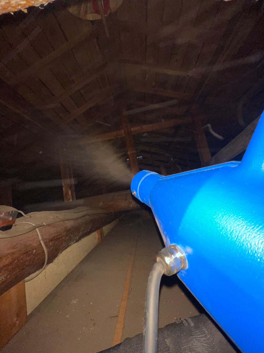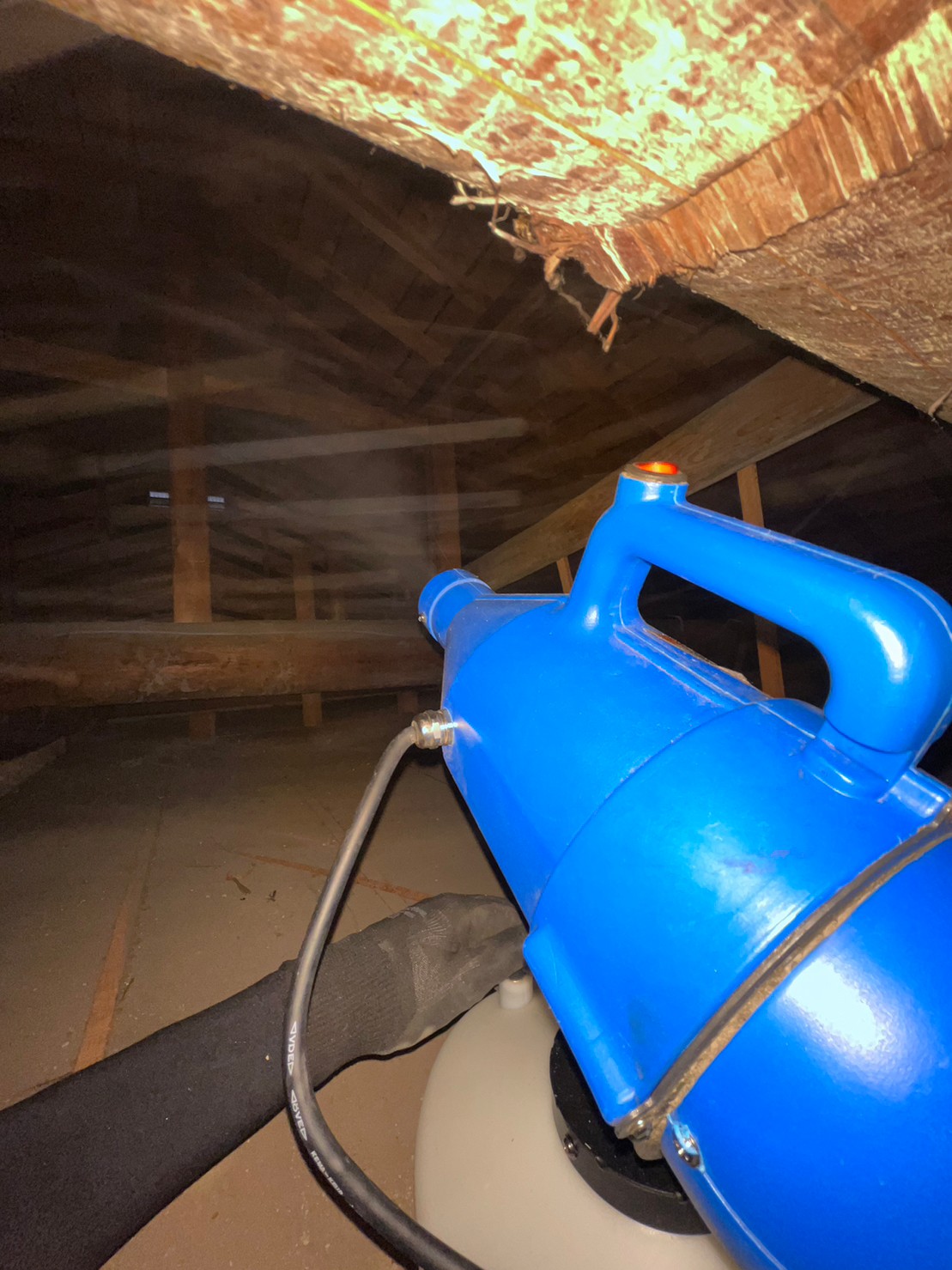作業の初めに、イタチの糞清掃や様々な作業を徹底して行えるように点検口を作成し、燻煙剤と呼ばれる薬剤を天井裏や床下に投入することで、イタチを追い出していきます。