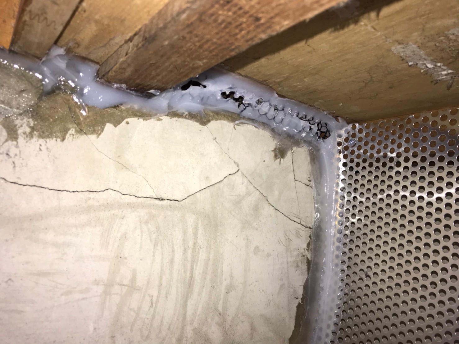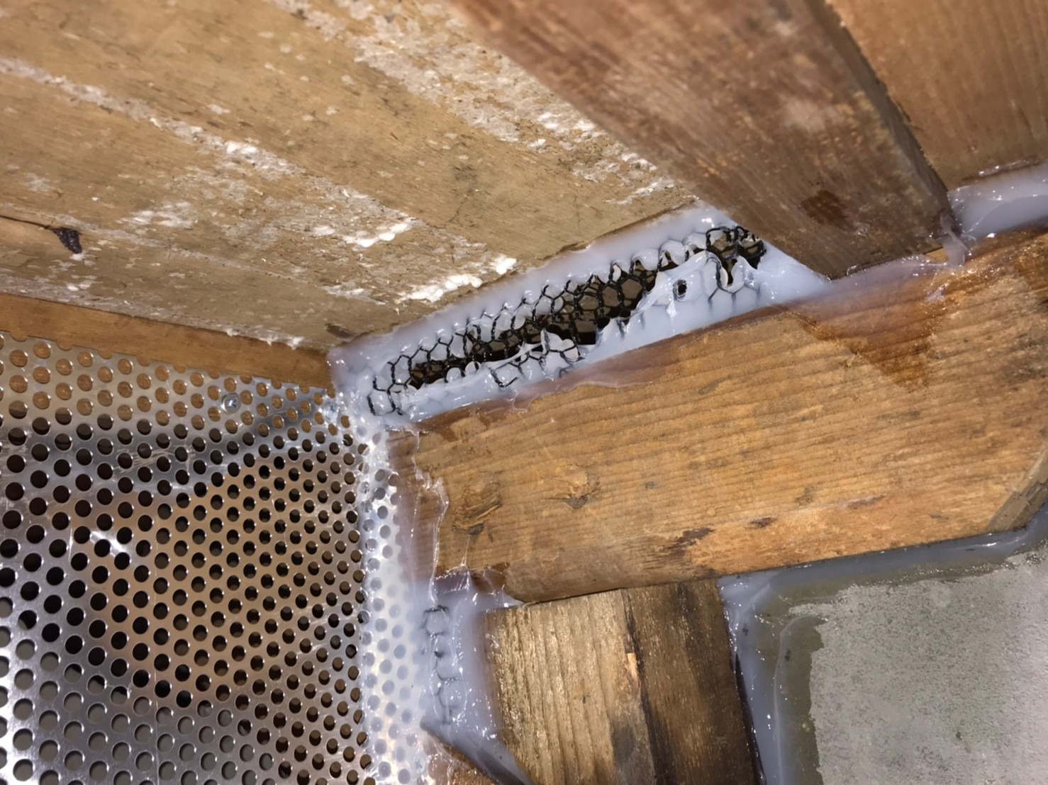 続いて、ネズミの再侵入を防ぐために、パンチングメタルや金網、コーキング剤などを用いて侵入経路の封鎖を行います。
