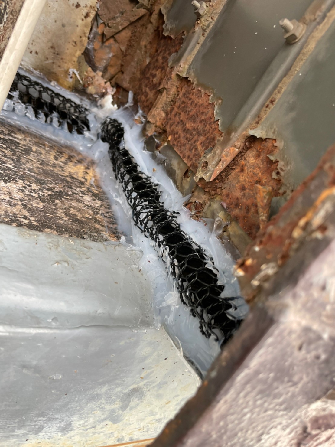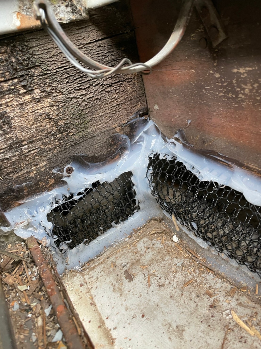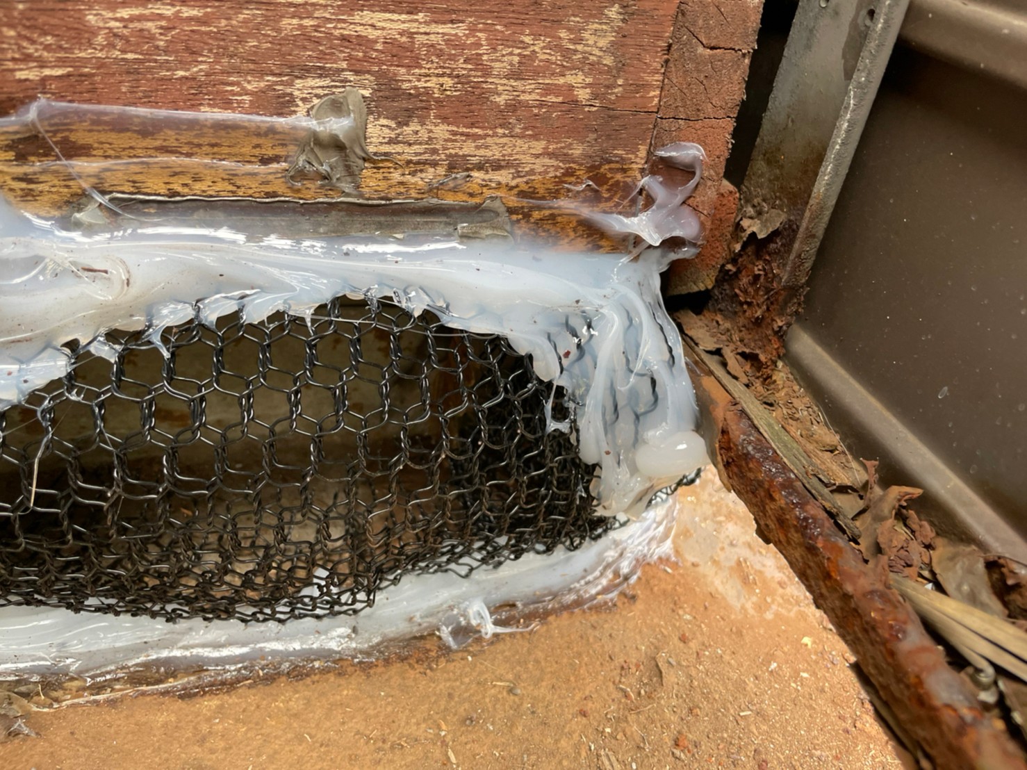 続いて、ネズミの再侵入を防ぐために、パンチングメタルや金網、コーキング剤などを用いて侵入経路の封鎖を行います。