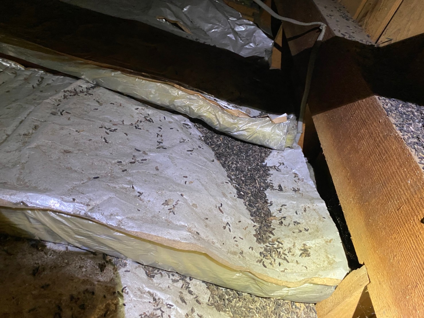コウモリは、その軽い体重を維持するために、毎日大量の糞をします。一日の糞の総重量は、その体重の1/3にもなると言われておりますので、他の害獣と比べてもその量の多さは群を抜いています。さらに、コウモリの糞は乾燥していてポロポロと崩れやすいため、空中に飛散した糞を人が吸い込んでしまうことで健康リスクにも晒されてしまいます。