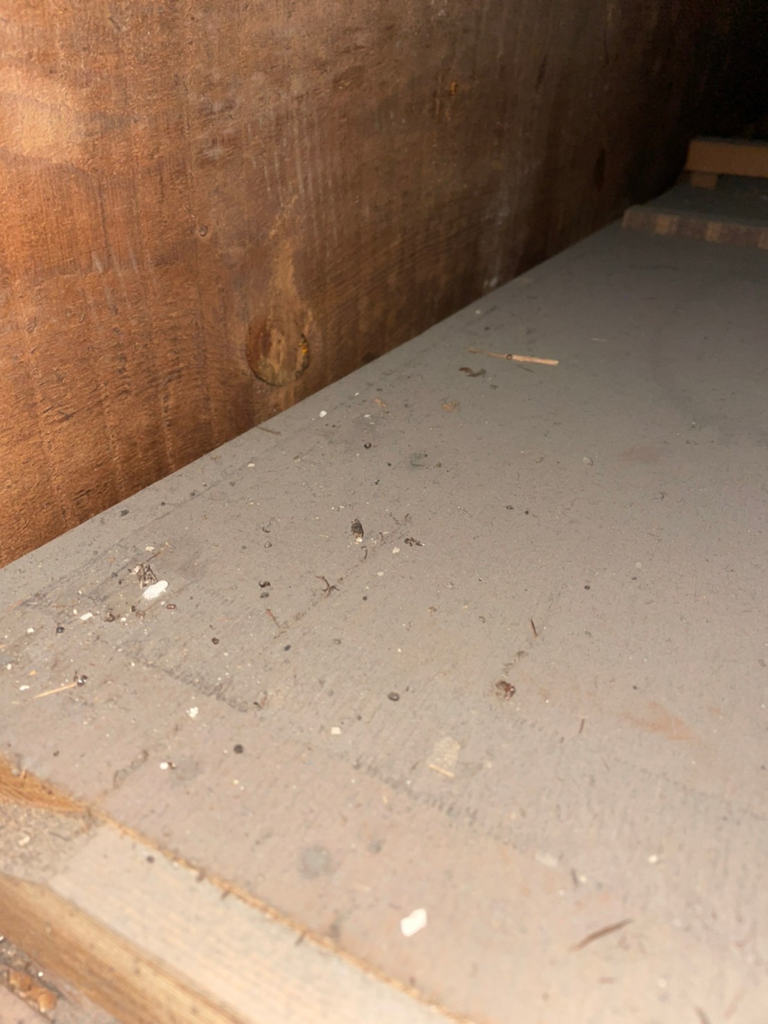 屋根裏ではネズミの糞が散らばっていました。侵入経路は、床下の通風孔や、ダクト配管からと考えられます。ネズミは床下やダクト排気口から侵入して、壁と外壁の間を登り、天井裏まで登ってしまいます。ですので、床下から侵入した形跡があるから、床下に居るはずだ、と決めつけられず家中に侵入・被害を拡大していくのです。