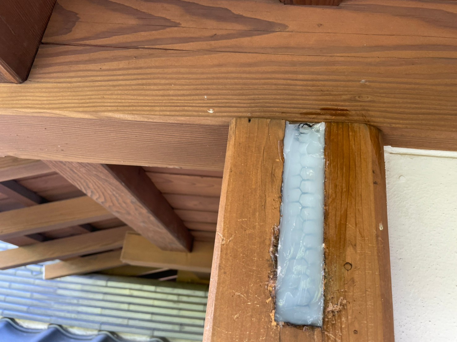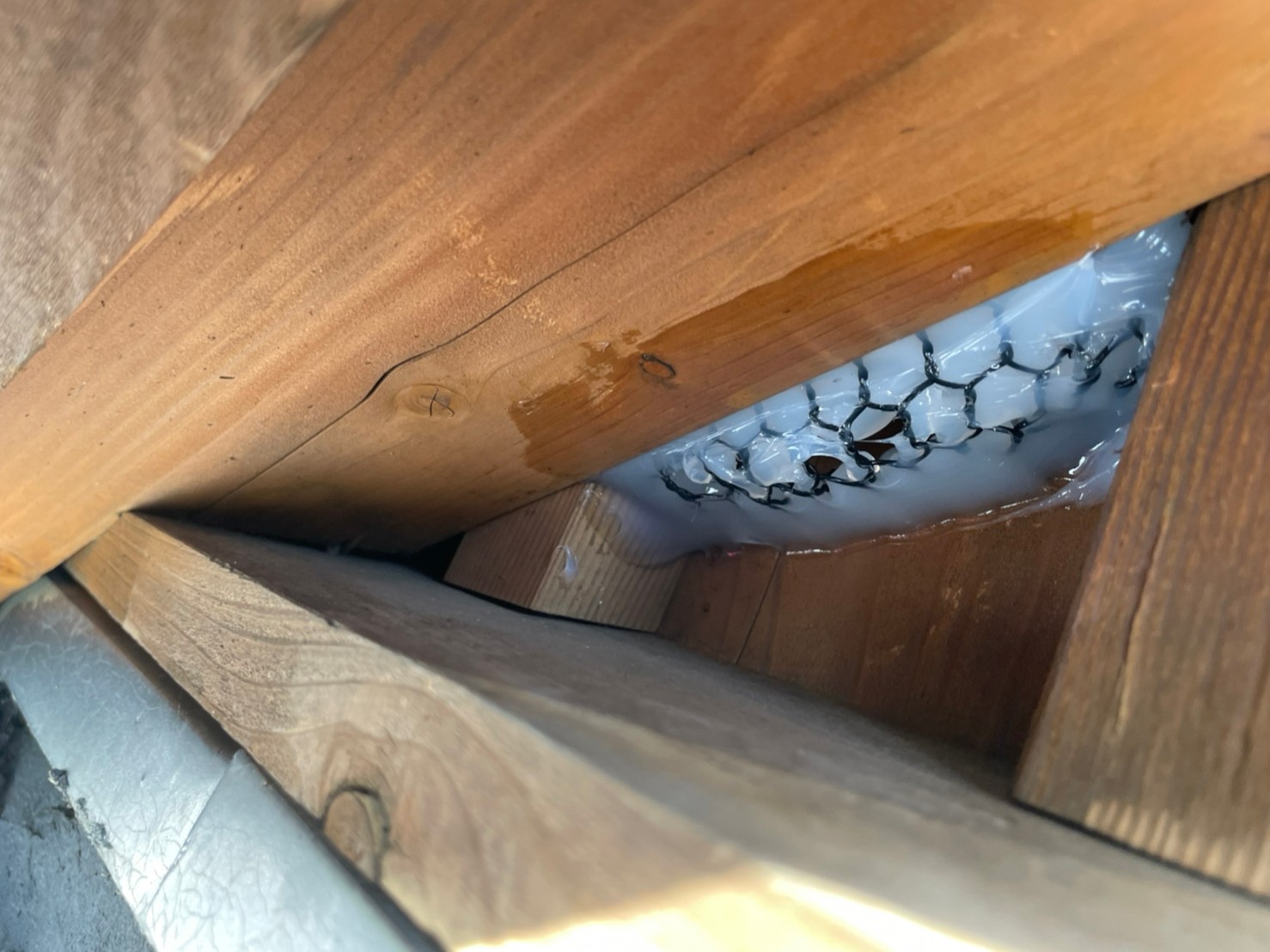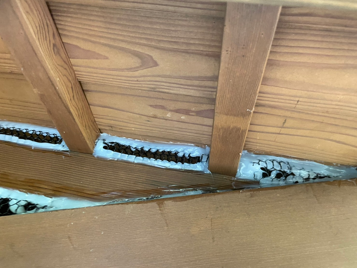 続いて、パンチングメタルや金網、コーキング剤などを用いて、あらゆる侵入経路を封鎖していきます。これによりアライグマに限らず、他の害獣の再侵入も防ぐことができます。