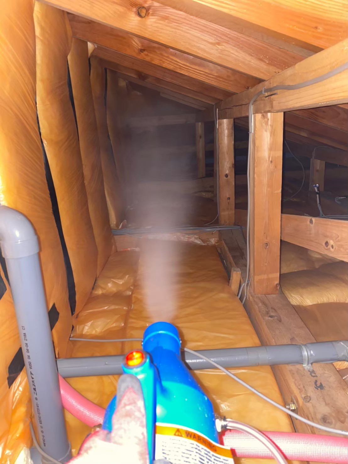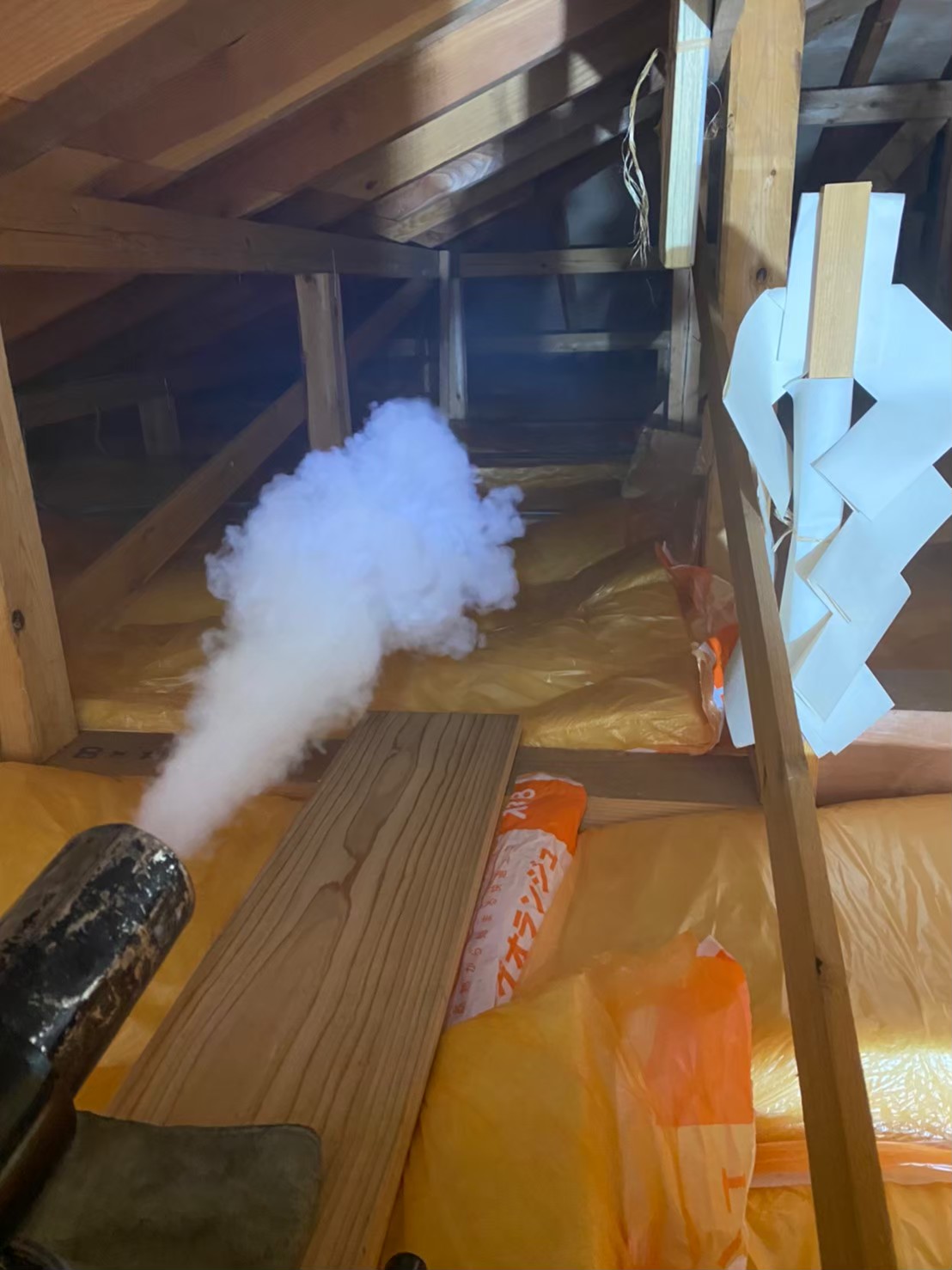 屋根裏では、大量の煙を噴射するくん煙剤での追い出し作業、その後の糞尿被害で付着した病原菌やノミ・ダニの消毒と消臭作業を施工しております。また、床下からの侵入やほかの害獣の侵入の有無の調査も兼ねて、床下でも作業も同時施工しております。