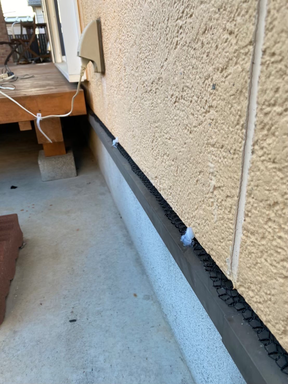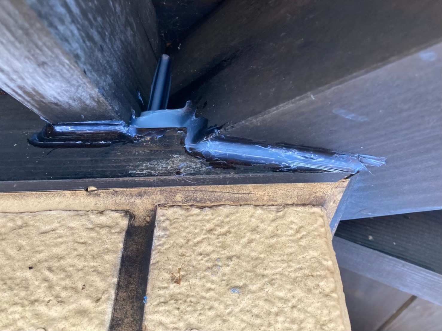 コウモリ被害は個人での対策が難しく、再発を繰り返しやすい害獣でもあります。今回、現場調査で判明した侵入経路は、降り棟と隅棟など角度がついた屋根の隙間が狙われておりました。コウモリは約1cmの隙間からでも侵入が可能なので、しっかりとコーキング材で隙間を塞ぐ施工をいたしました。また、基礎と外壁の隙間で、通気孔の役目も兼ねている水切りの部分も、侵入経路とされていたので、すべてを金網とコーキング材で封鎖しております。