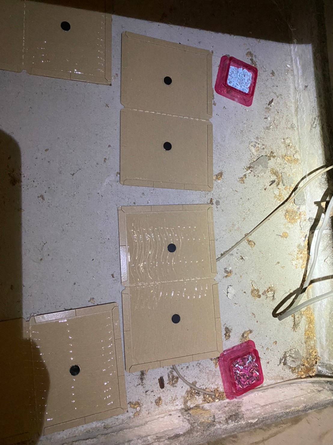 封鎖作業の後は、糞清掃や殺菌・消毒、マーキング消臭、ノミ・ダニ駆除、毒エサ・トラップ設置といった残りの行程を順序良く行い、終了です。