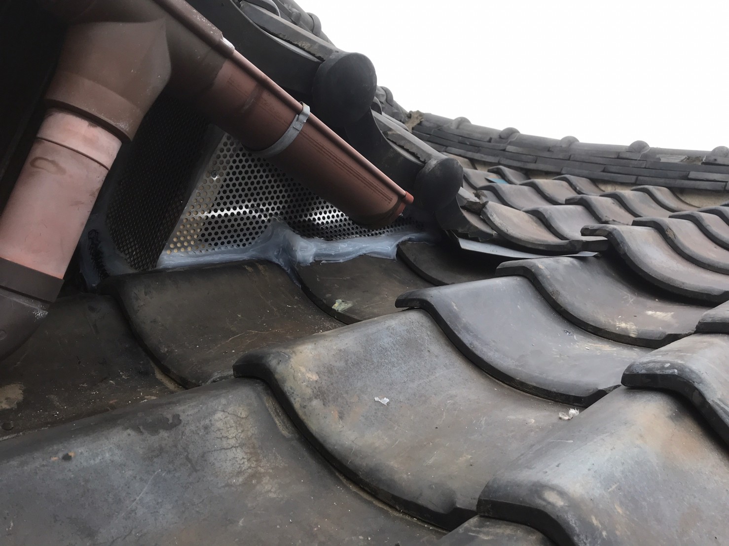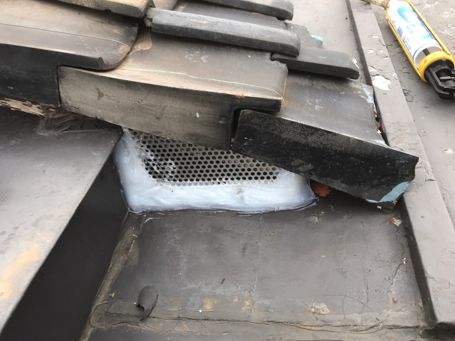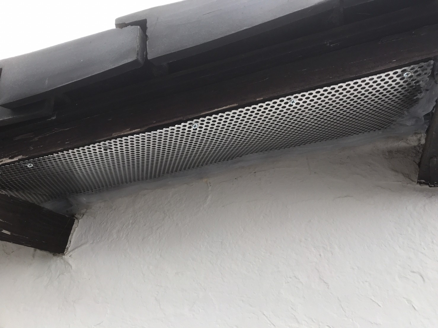 続いて、アライグマの再侵入を防ぐために、パンチングメタルや金網、コーキング剤などを用いて侵入経路の封鎖を行います。