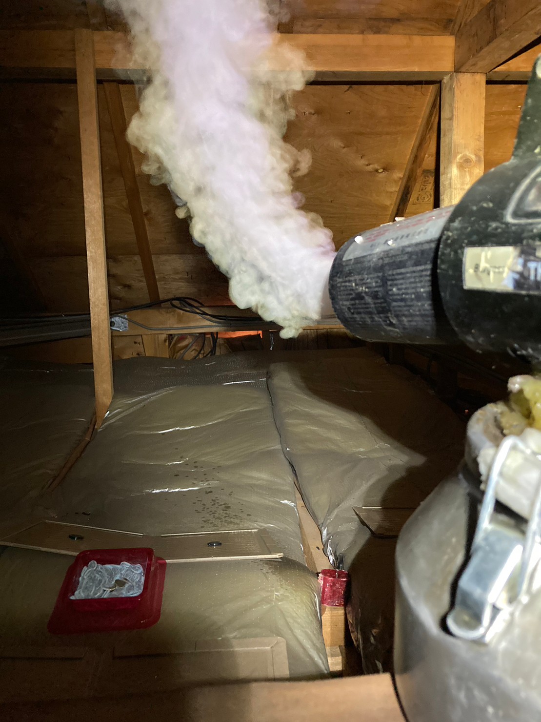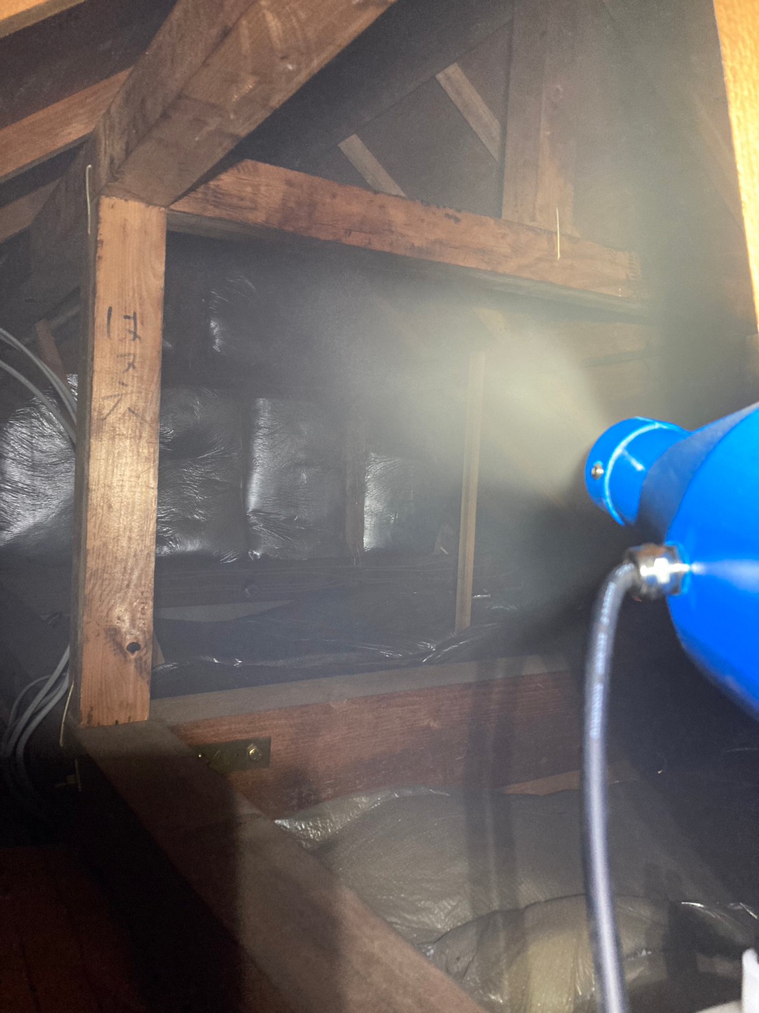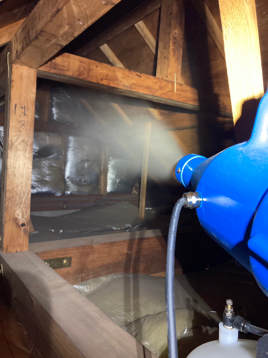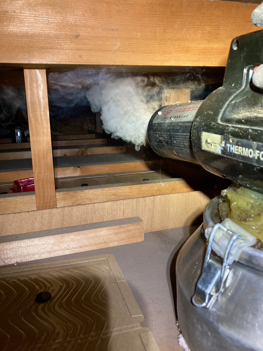 作業の初めに、ネズミの糞清掃や様々な作業を徹底して行えるように点検口を作成し、燻煙剤と呼ばれる薬剤を天井裏や床下に投入することで、ネズミを追い出していきます。