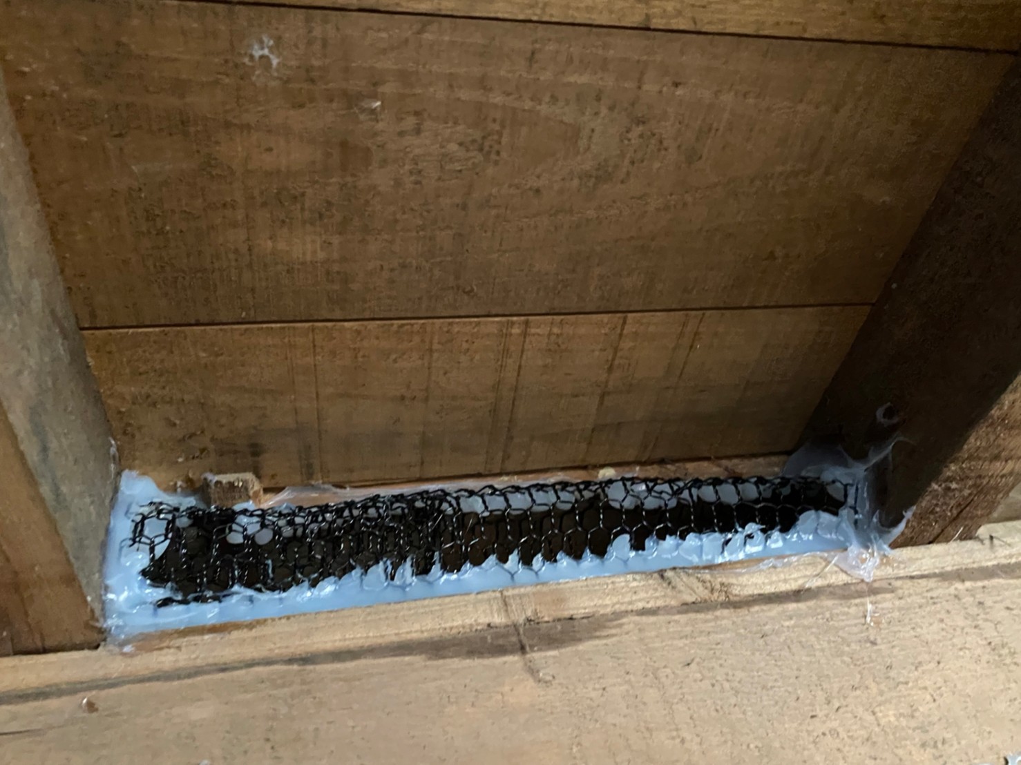 続いて、ネズミの再侵入を防ぐために、パンチングメタルや金網、コーキング剤などを用いて侵入経路の封鎖を行います。
