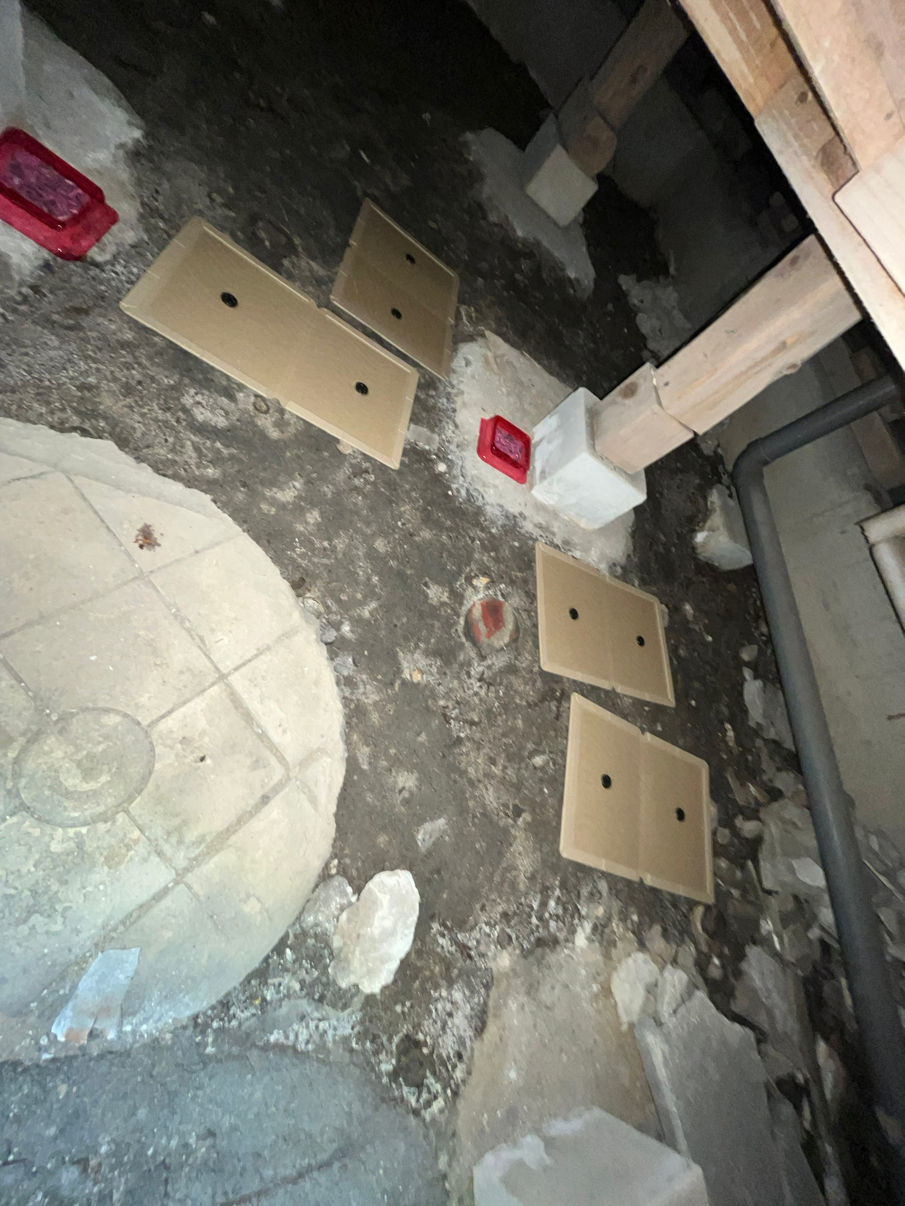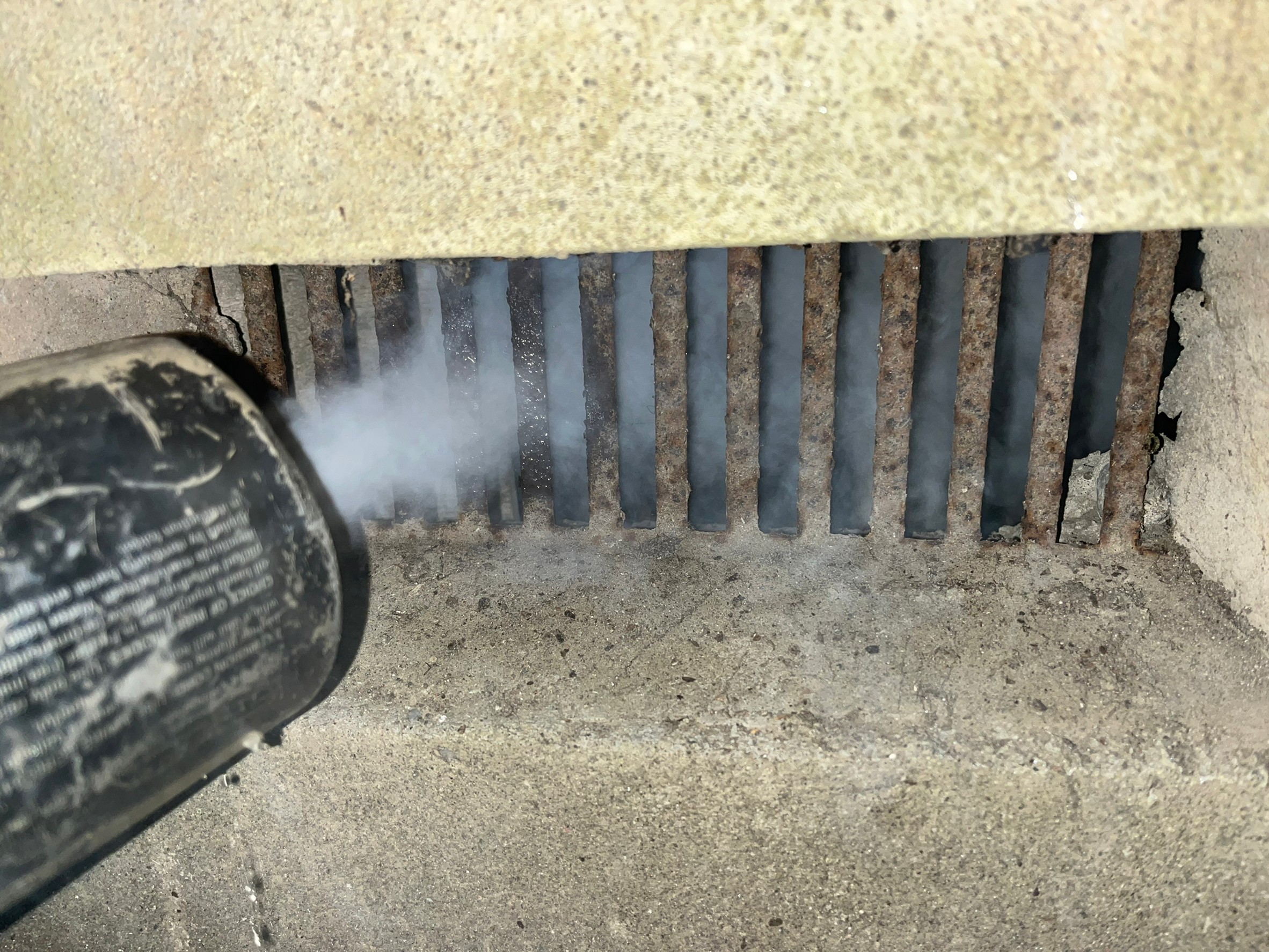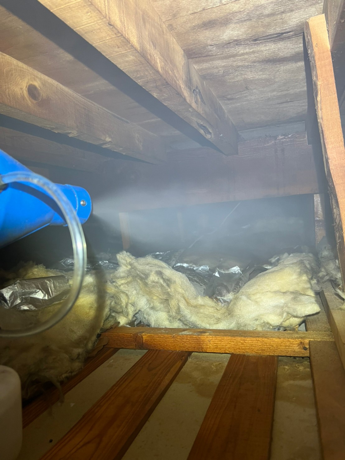 作業の初めに、ネズミの糞清掃や様々な作業を徹底して行えるように点検口を作成し、燻煙剤と呼ばれる薬剤を天井裏や床下に投入することで、ネズミを追い出していきます。