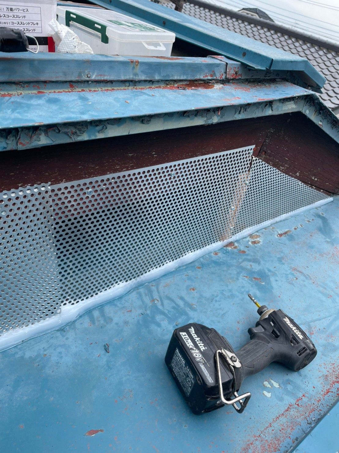 続いて、パンチングメタルや金網、コーキング剤などを用いて、あらゆる侵入経路を封鎖していきます。これによりアライグマに限らず、他の害獣の再侵入も防ぐことができます。