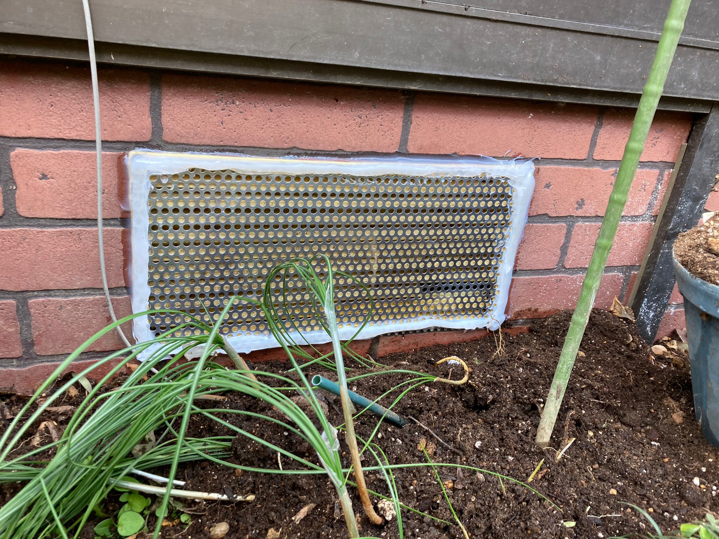 続いて、ネズミの再侵入を防ぐために、パンチングメタルや金網、コーキング剤などを用いて侵入経路の封鎖を行います。