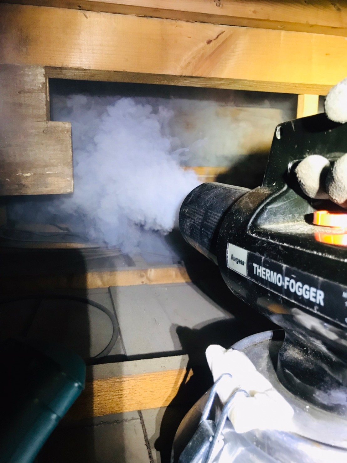まずは、燻煙剤と呼ばれる薬剤を天井裏や床下に投入することで、ネズミ、アライグマを追い出していきます。