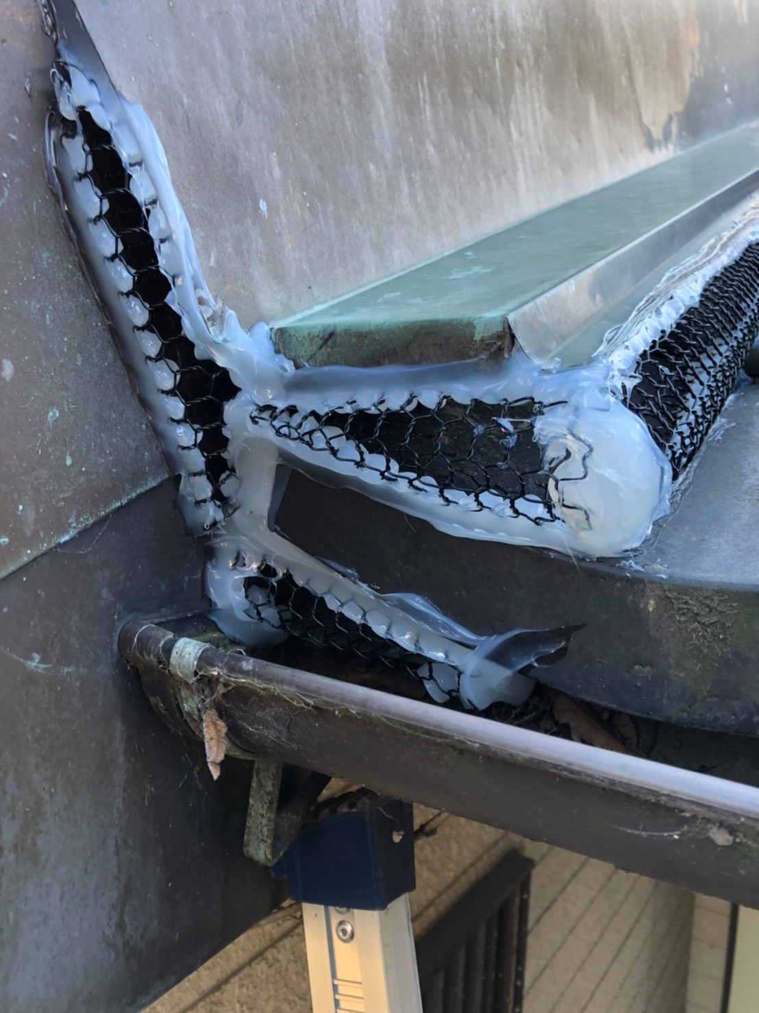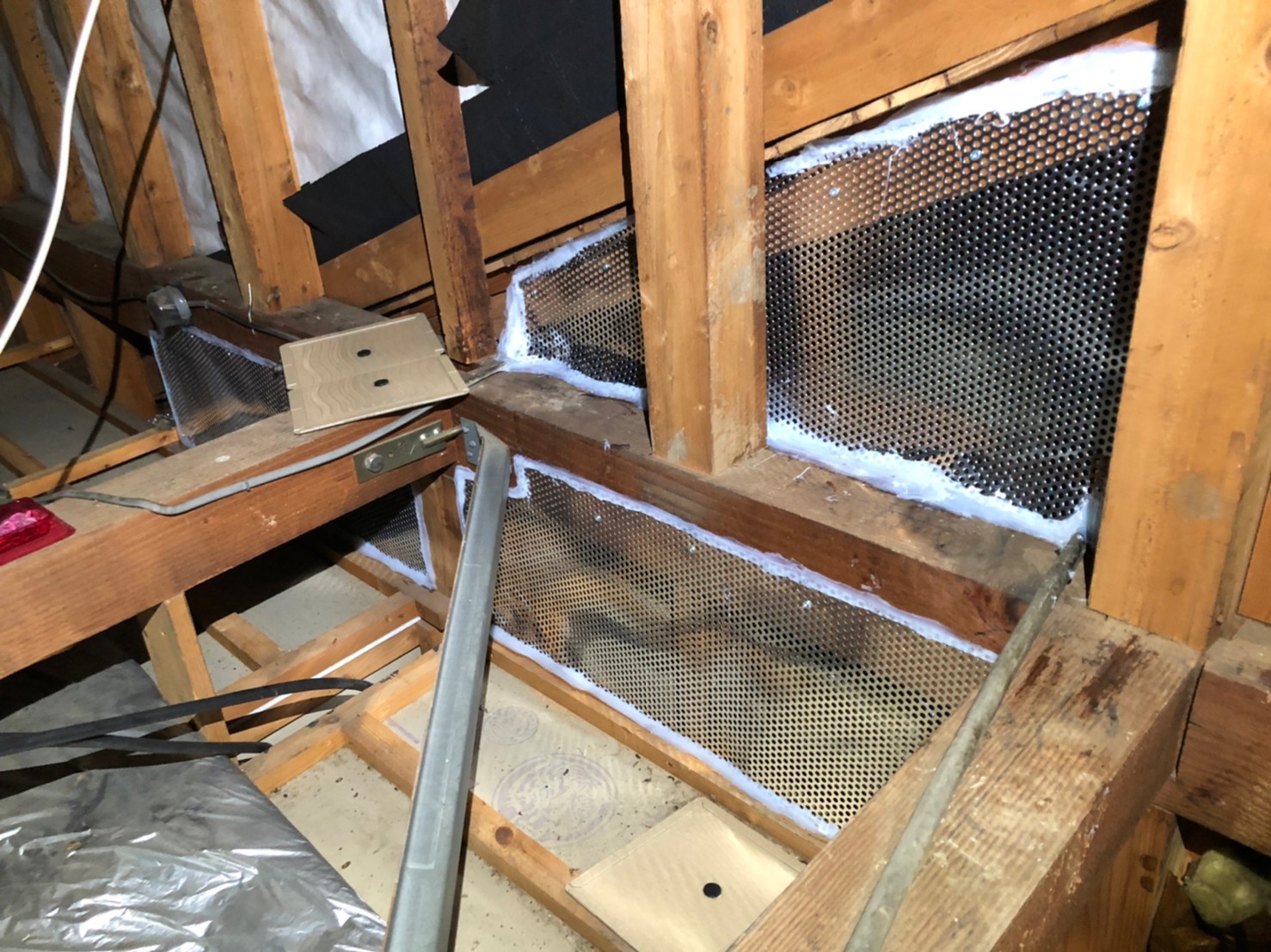 3枚目の写真のように屋根部分には、完全に塞ぐには難しい隙間がたくさんあります。そのような隙間もくまなく塞ぎます。また屋根裏の広範囲には、パンチングメタルを使用して隙間なく塞いでいきます。