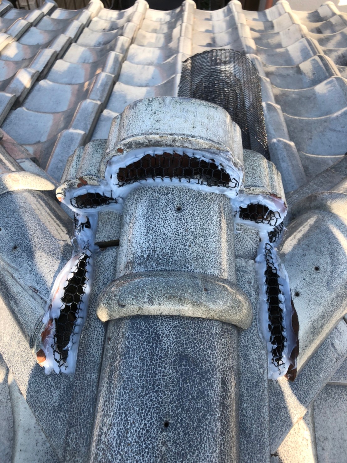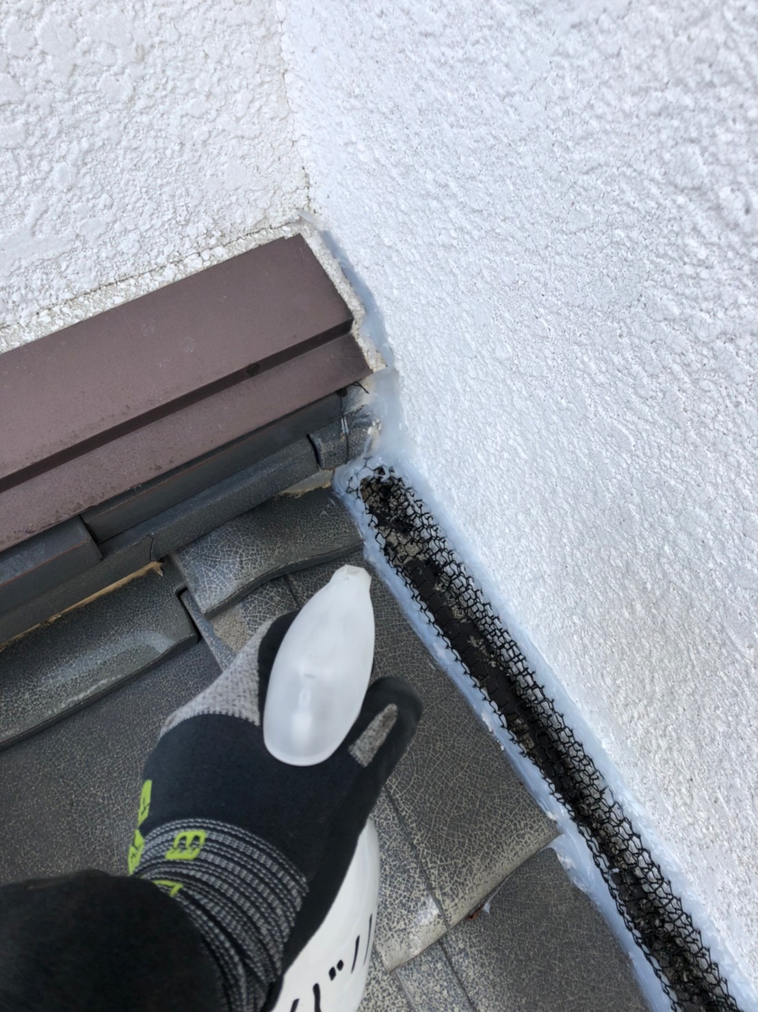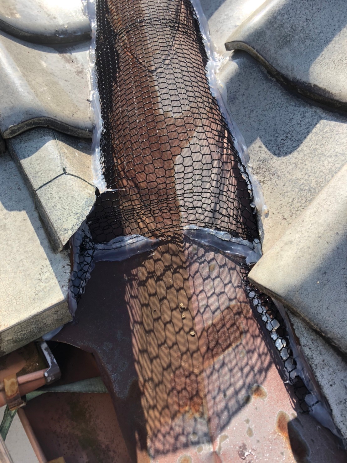 続いて、ハクビシンの再侵入を防ぐために、パンチングメタルや金網、コーキング剤などを用いて侵入経路の封鎖を行います。