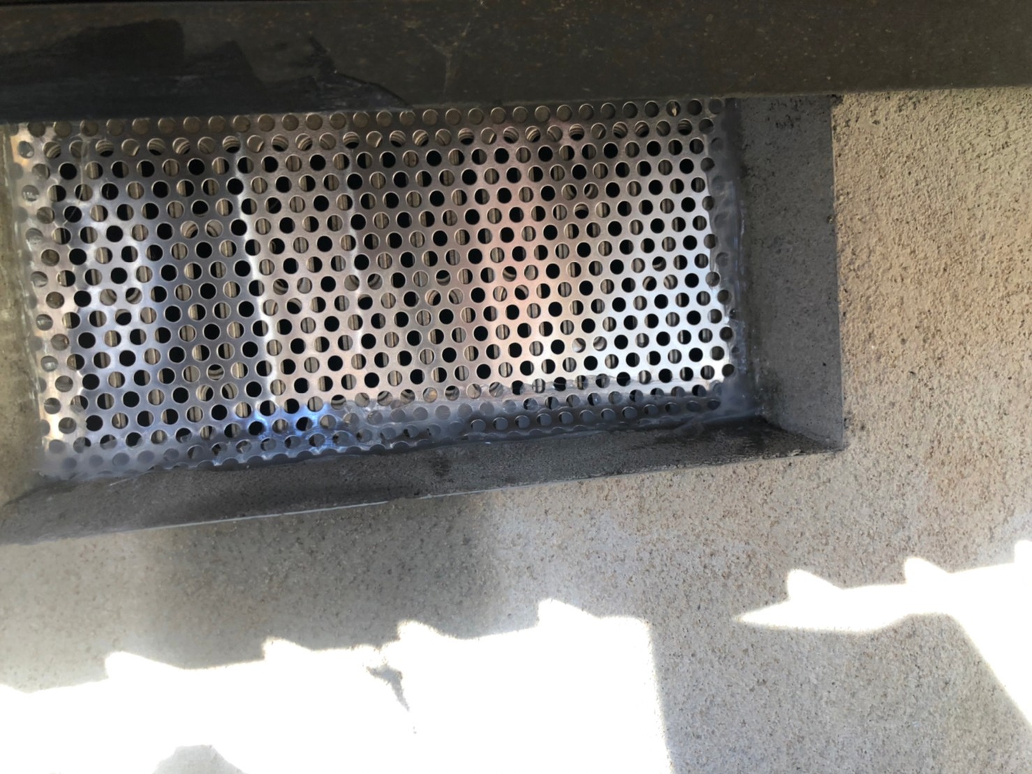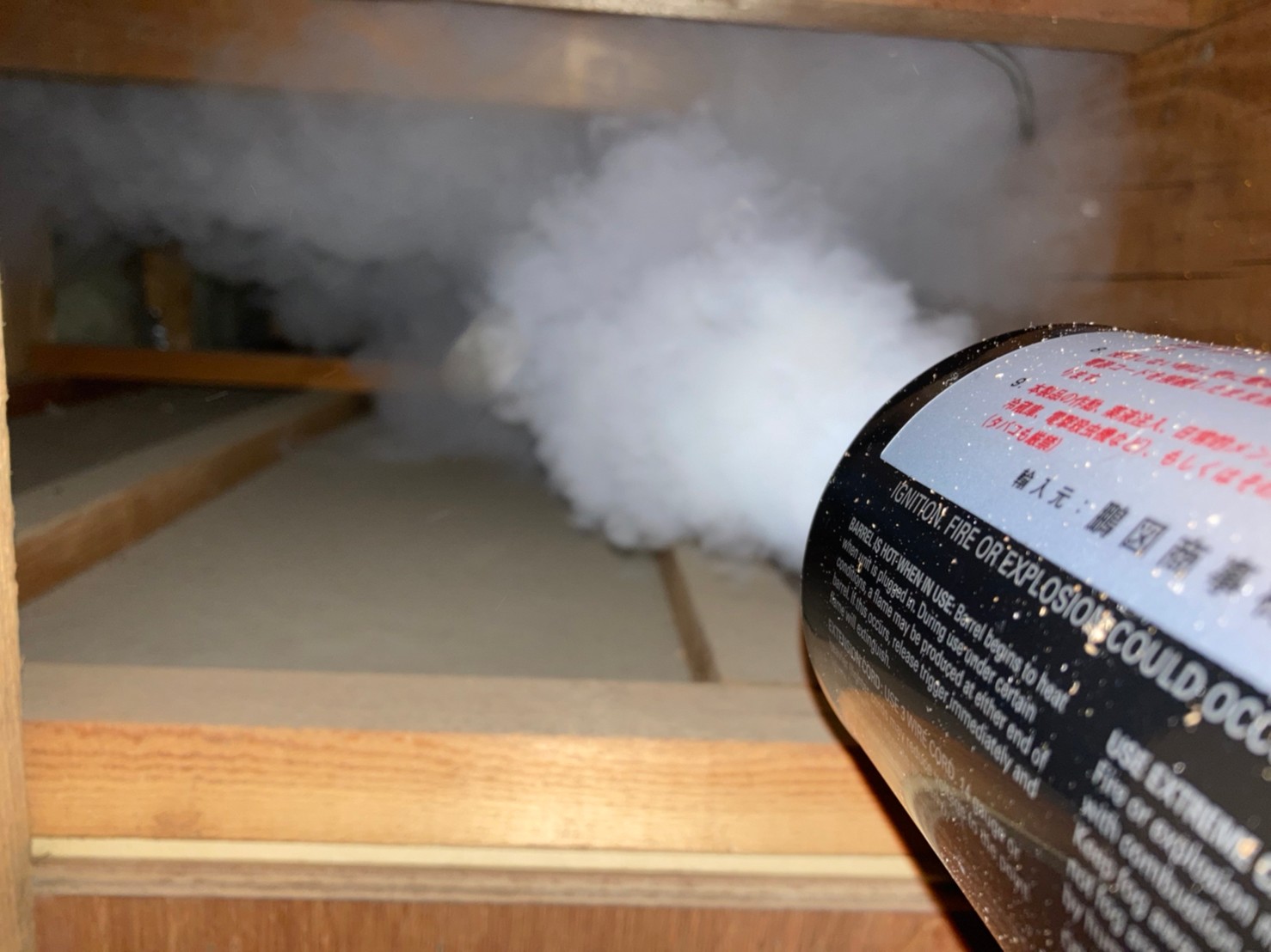 燻煙材などを使用してネズミを追い出し、糞などの清掃や消毒、消臭します。そして忌避剤を設置して、パンチングメタルやコーキング剤などでしっかり侵入口を封鎖しました。