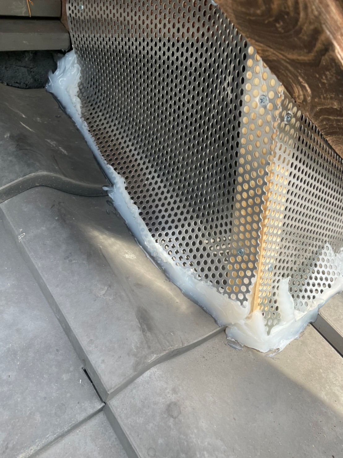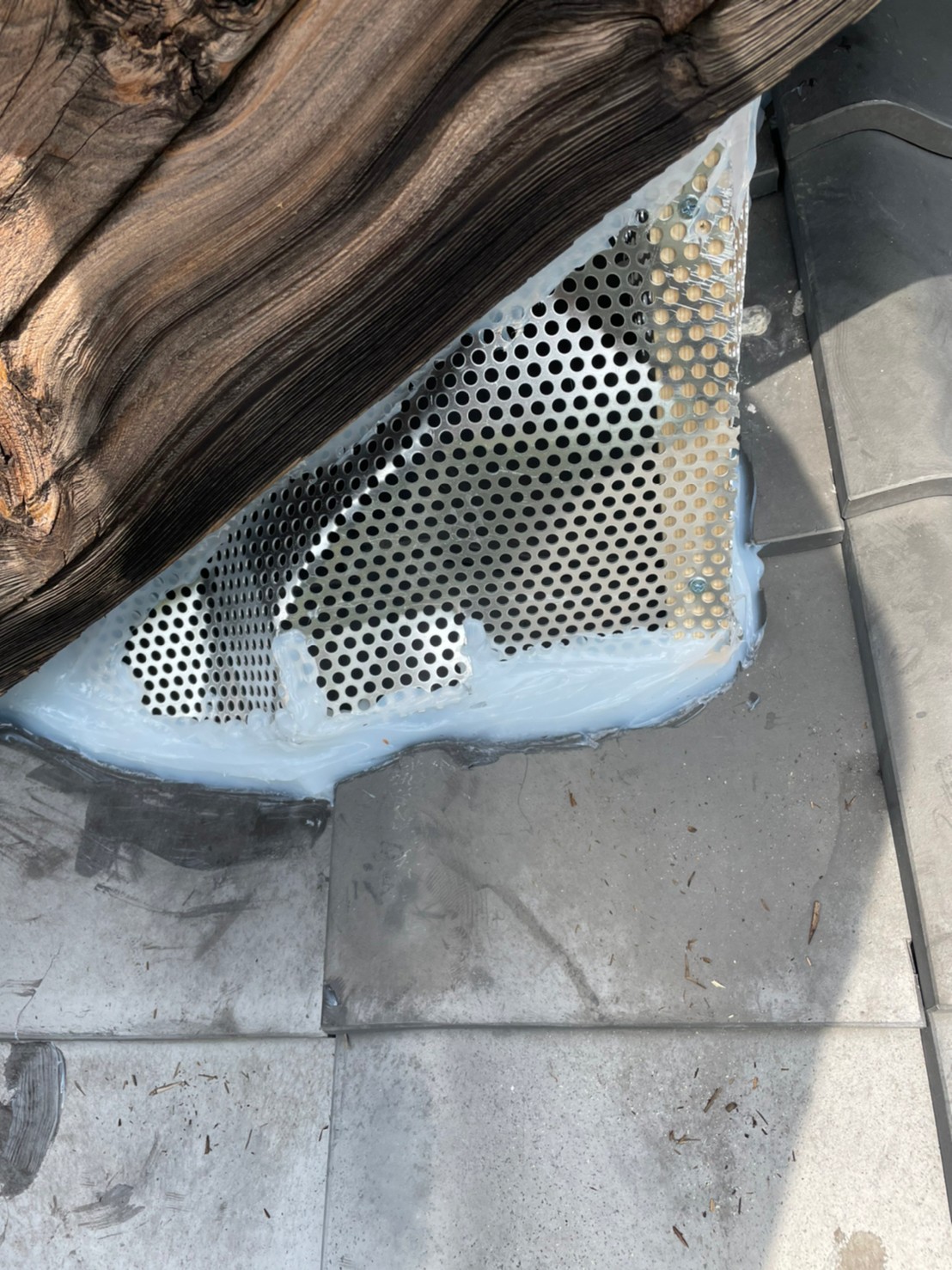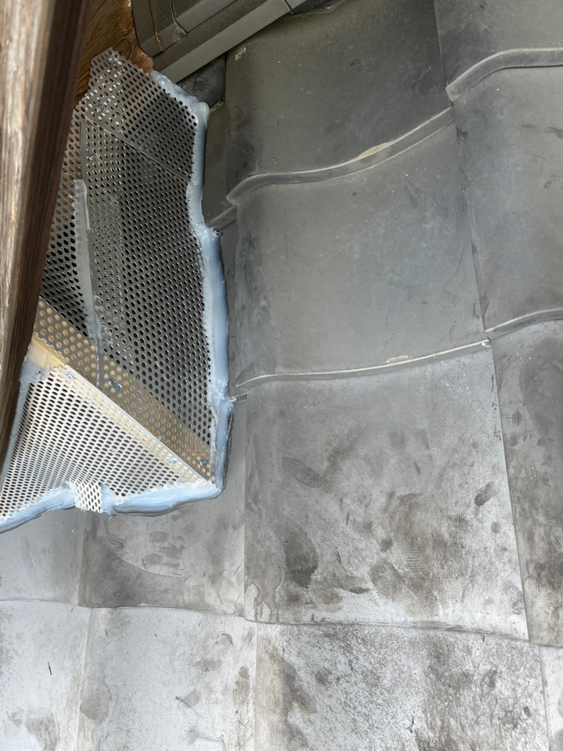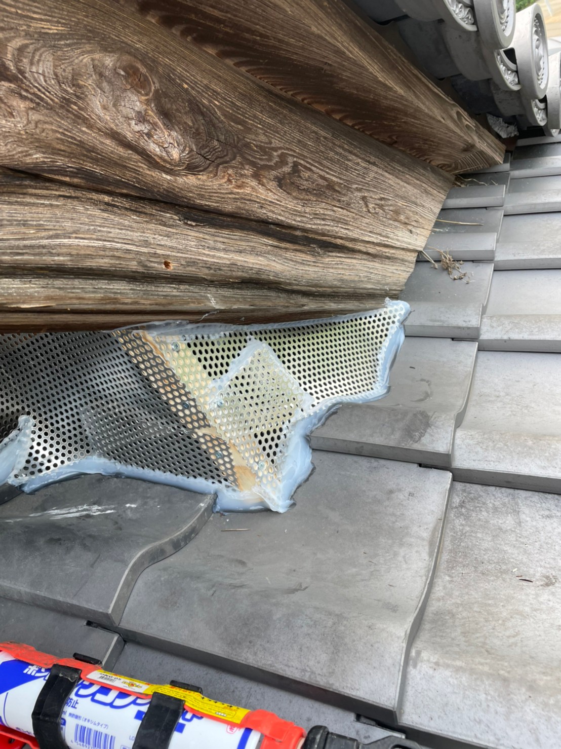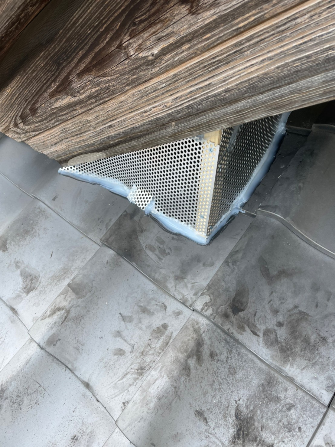 続いて、ハクビシンの再侵入を防ぐために、パンチングメタルや金網、コーキング剤などを用いて侵入経路の封鎖を行います。