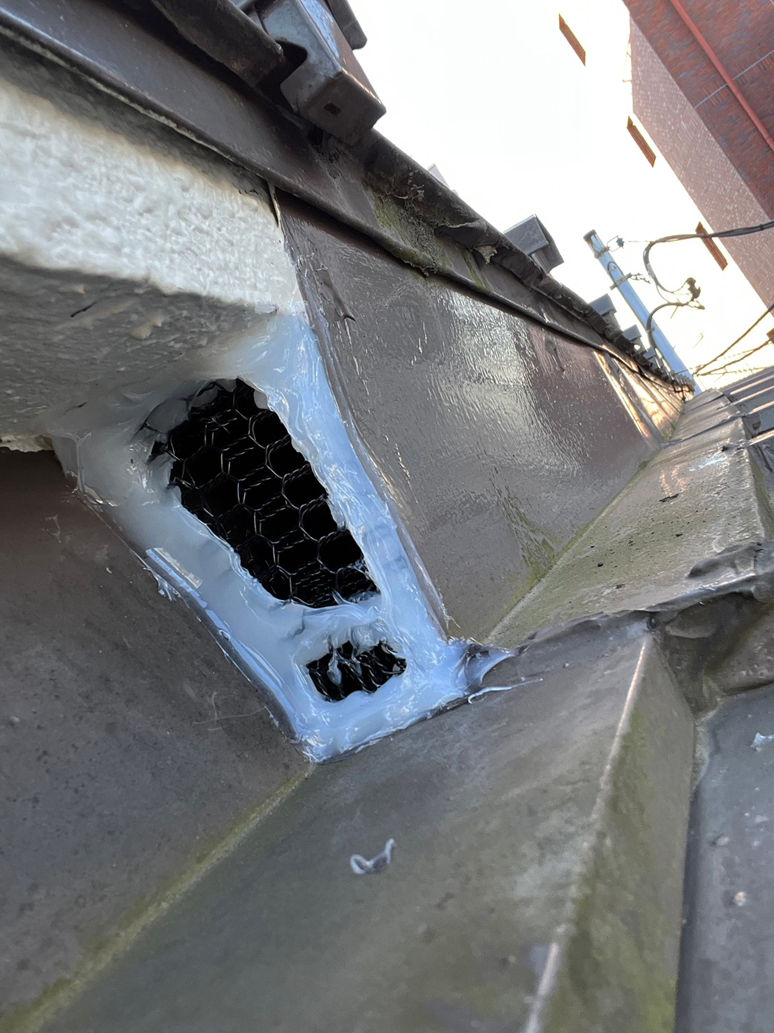 続いて、ネズミの再侵入を防ぐために、パンチングメタルや金網、コーキング剤などを用いて侵入経路の封鎖を行います。