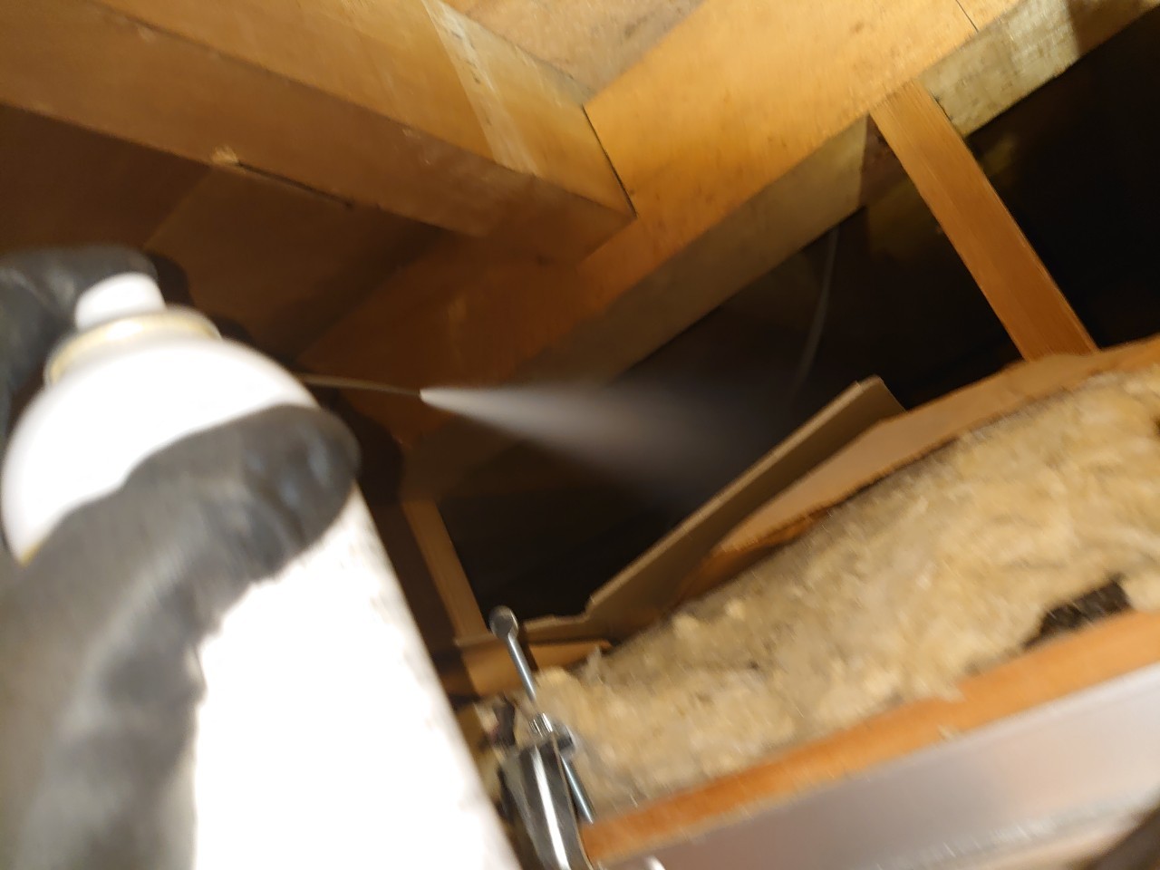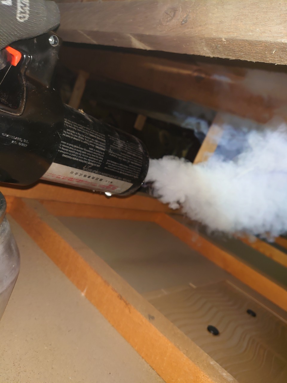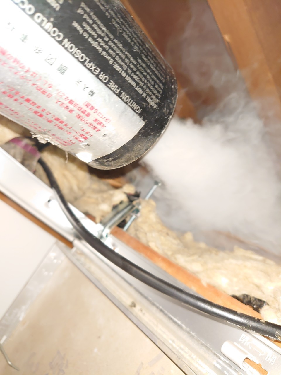 作業の初めに、ネズミの糞清掃や様々な作業を徹底して行えるように点検口を作成し、燻煙剤と呼ばれる薬剤を天井裏や床下に投入することで、ネズミを追い出していきます。