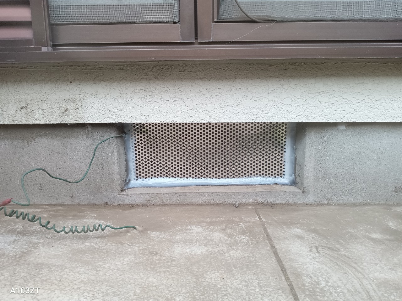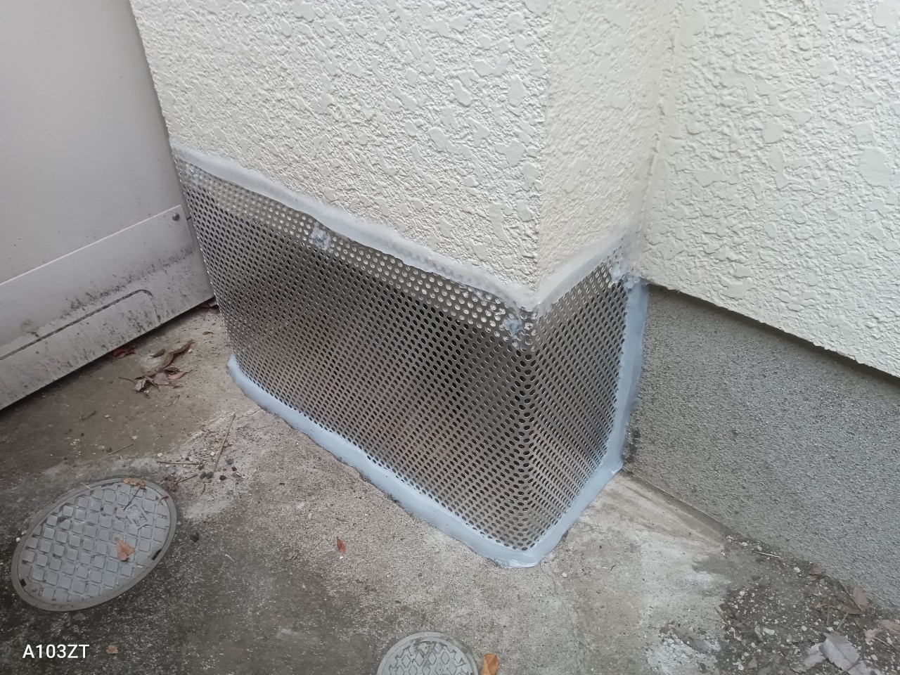 続いて、パンチングメタルや金網、コーキング剤などを用いて、あらゆる侵入経路を封鎖していきます。これによりネズミに限らず、他の害獣の再侵入も防ぐことができます。