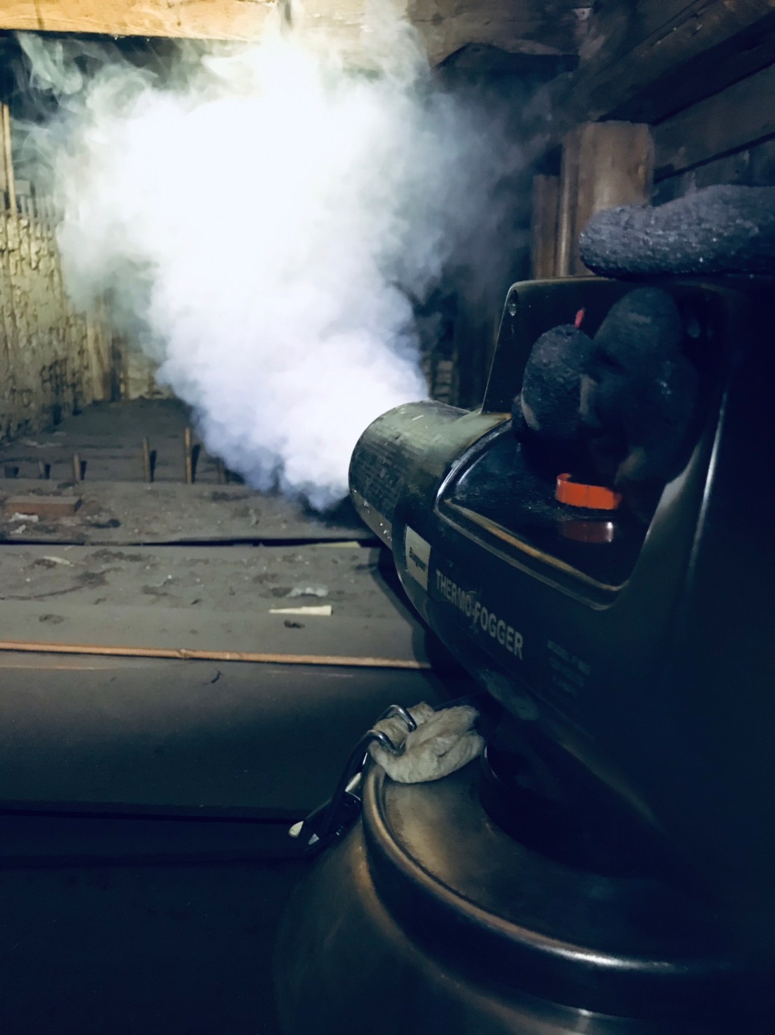 まずは、ネズミの巣がある場所に点検口を作成し、燻煙剤と呼ばれる薬剤を天井裏や床下に投入することで、ネズミを追い出していきます。