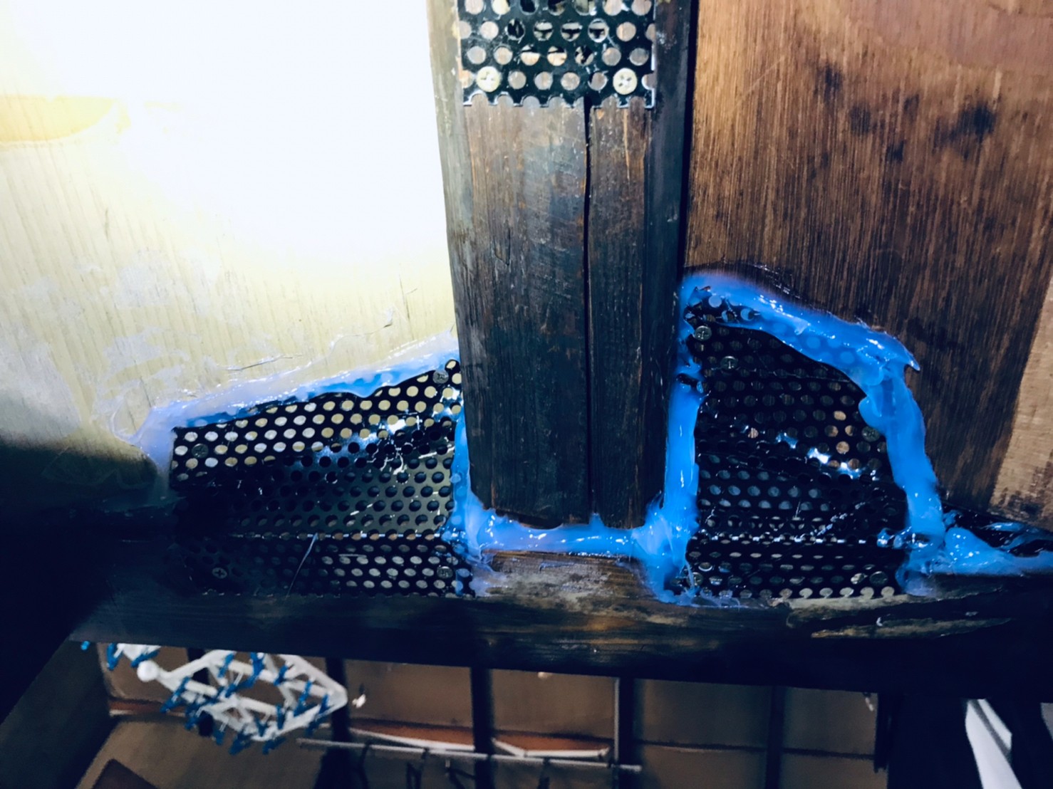 続いて、ネズミの再侵入を防ぐために、パンチングメタルや金網、コーキング剤などを用いて侵入経路の封鎖を行います。