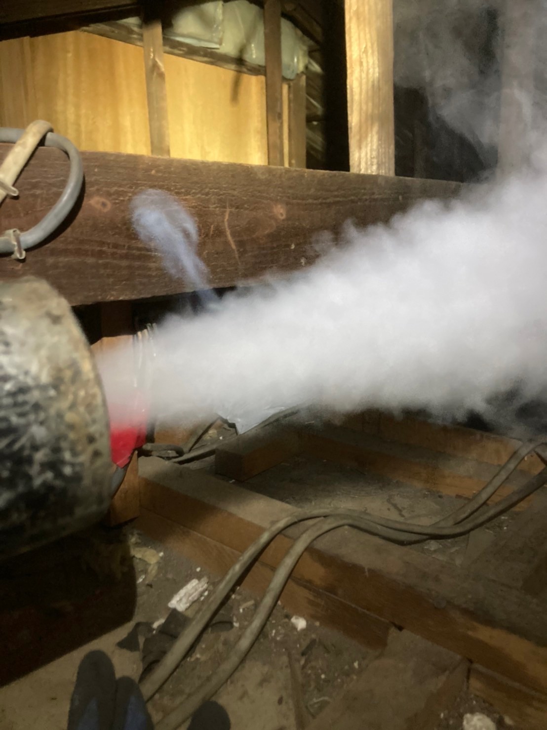 まずは、ハクビシンの巣がある場所に点検口を作成し、燻煙剤と呼ばれる薬剤を天井裏や床下に投入することで、ハクビシンを追い出していきます。