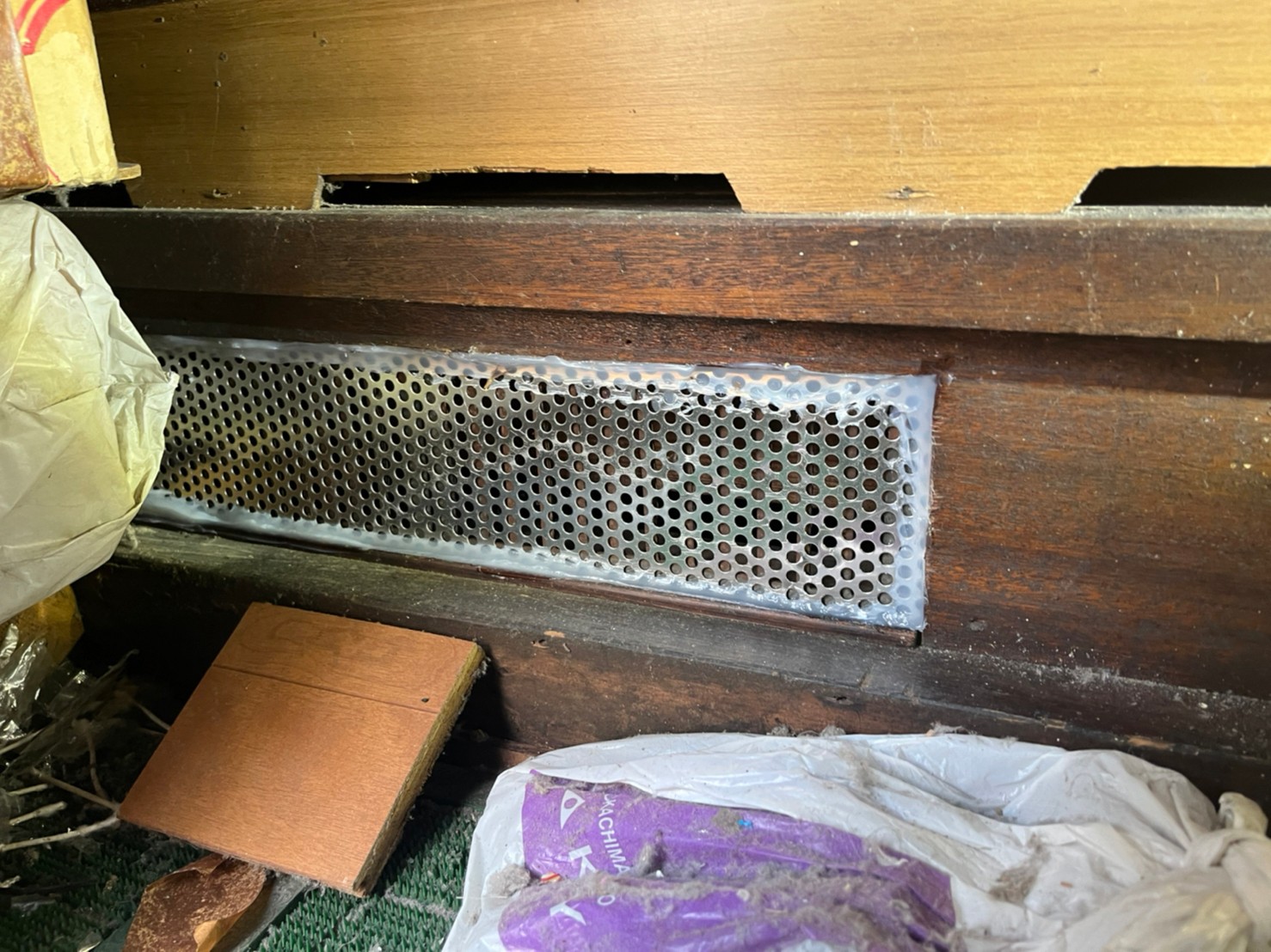 続いて、ネズミの再侵入を防ぐために、パンチングメタルや金網、コーキング剤などを用いて侵入経路の封鎖を行います。