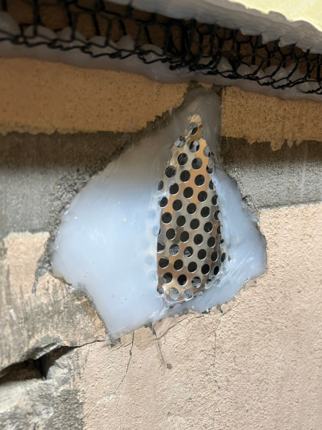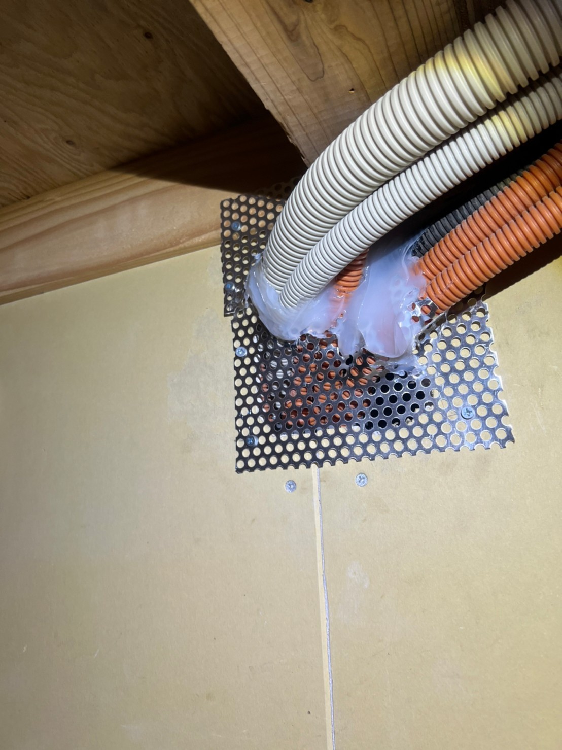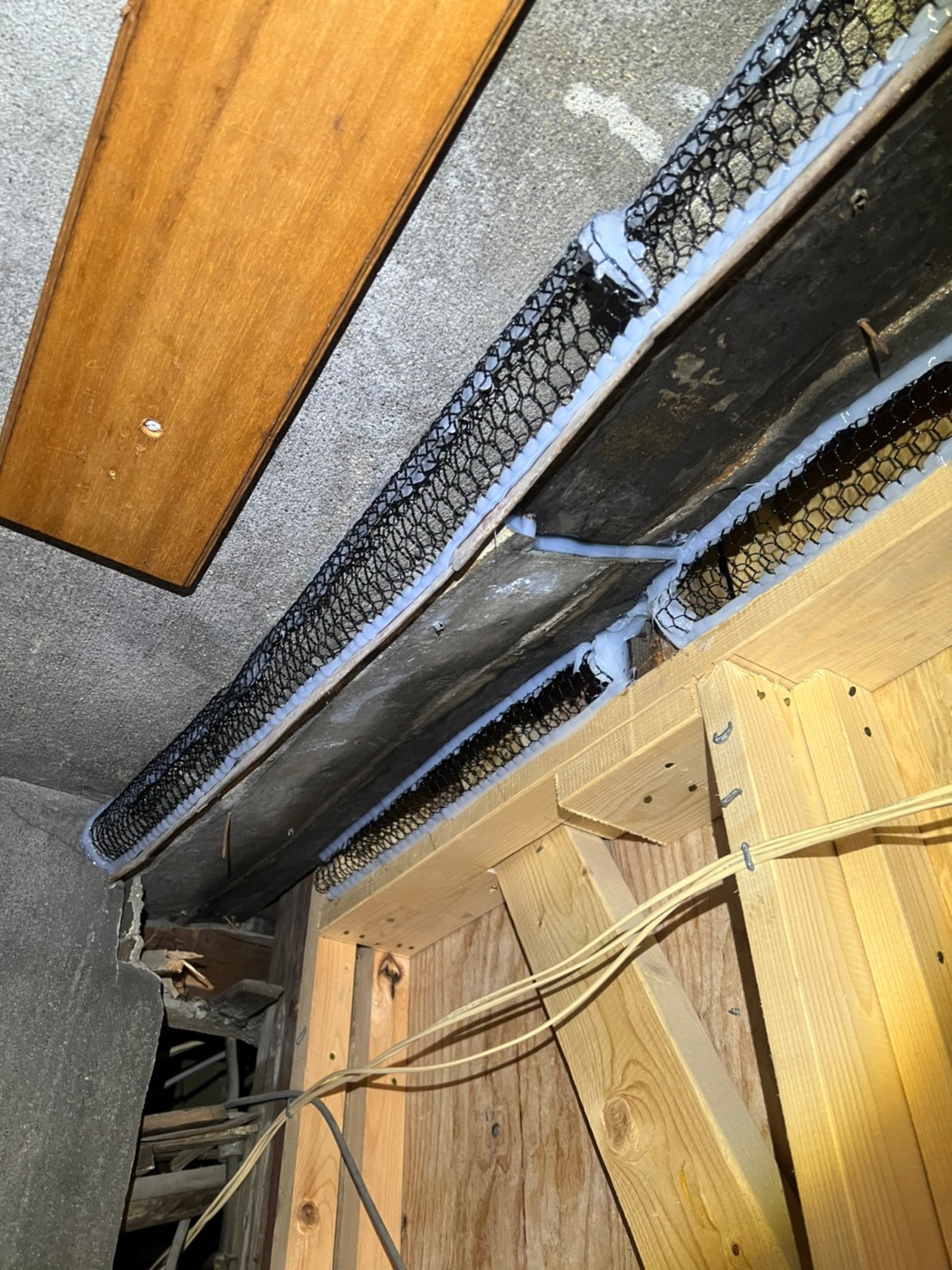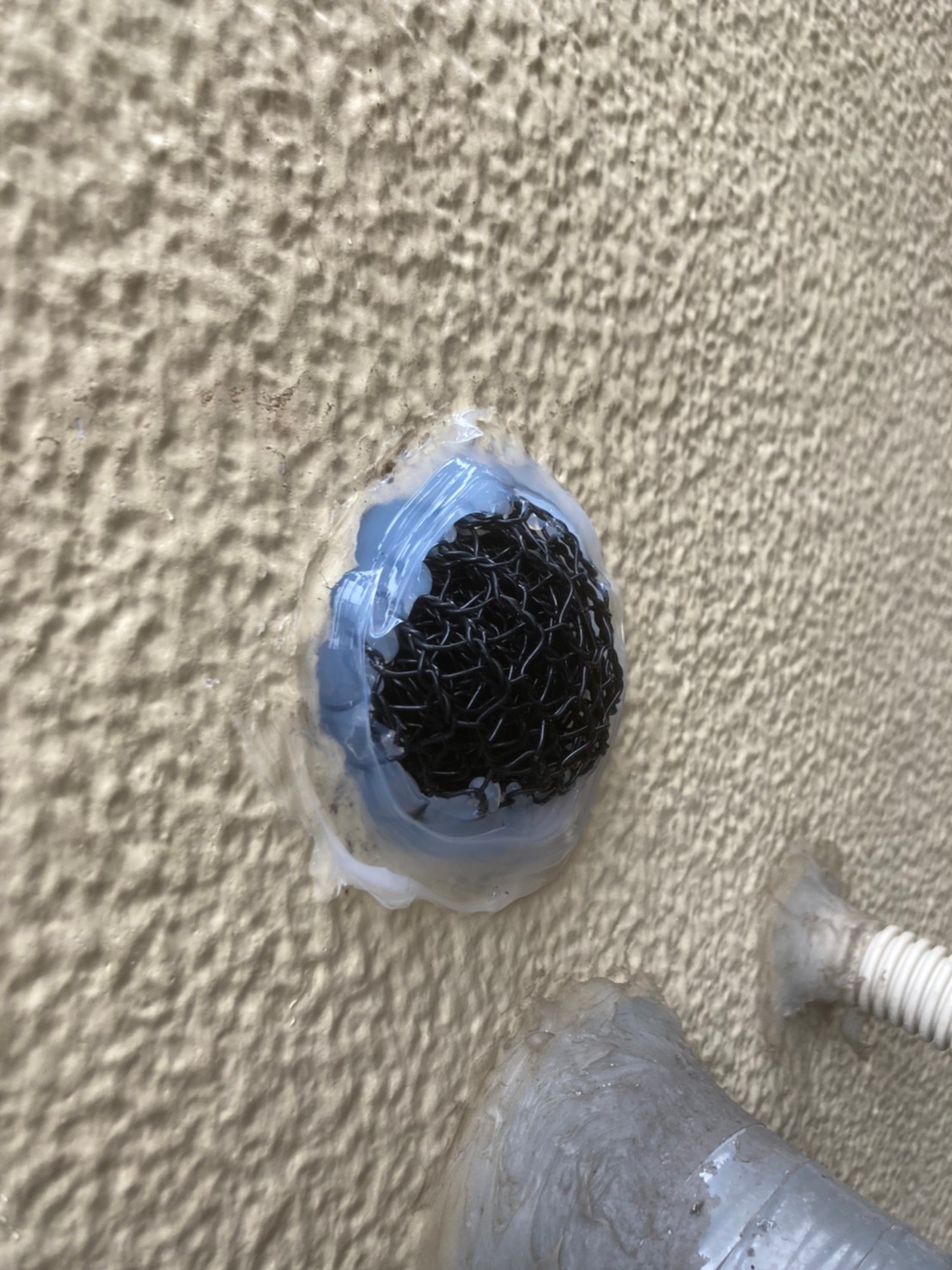 続いて、ネズミの再侵入を防ぐために、パンチングメタルや金網、コーキング剤などを用いて侵入経路の封鎖を行います。