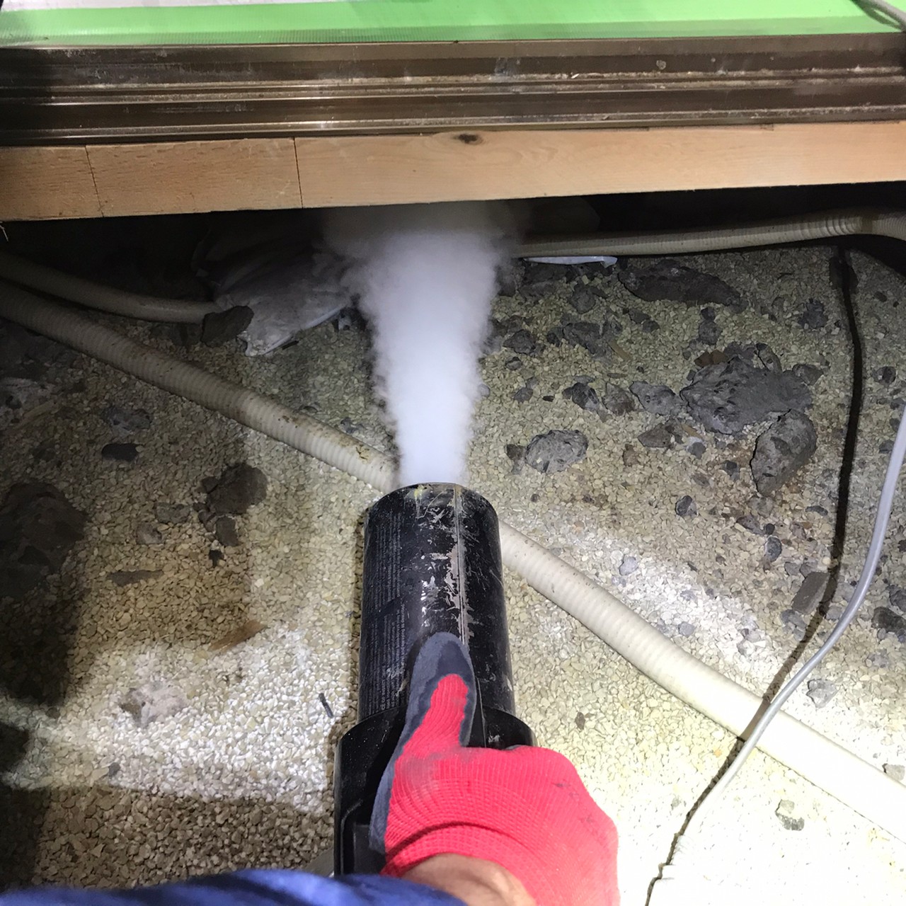 作業の初めに、アライグマの糞清掃や様々な作業を徹底して行えるように点検口を作成し、燻煙剤と呼ばれる薬剤を天井裏や床下に投入することで、アライグマを追い出していきます。