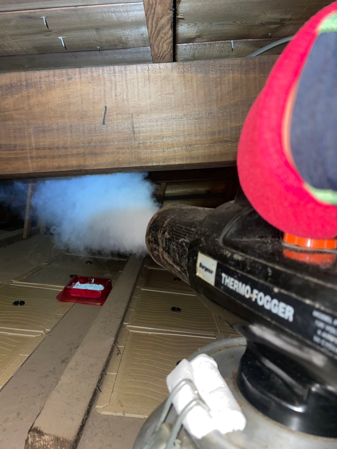 まずは、燻煙剤と呼ばれる薬剤を天井裏や床下に投入することで、ネズミを追い出していきます。