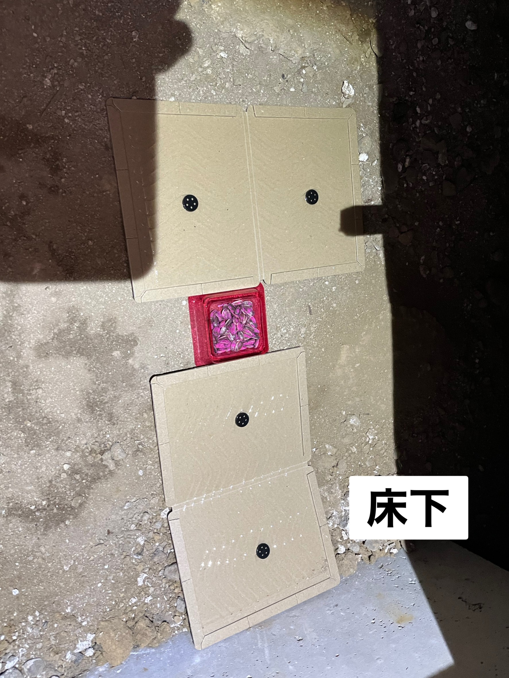 最後に、糞清掃や殺菌・消毒、マーキング消臭、ノミ・ダニ駆除、毒エサ・トラップ設置といった残りの作業を行い、駆除~再発防止までの工程が全て終了します。