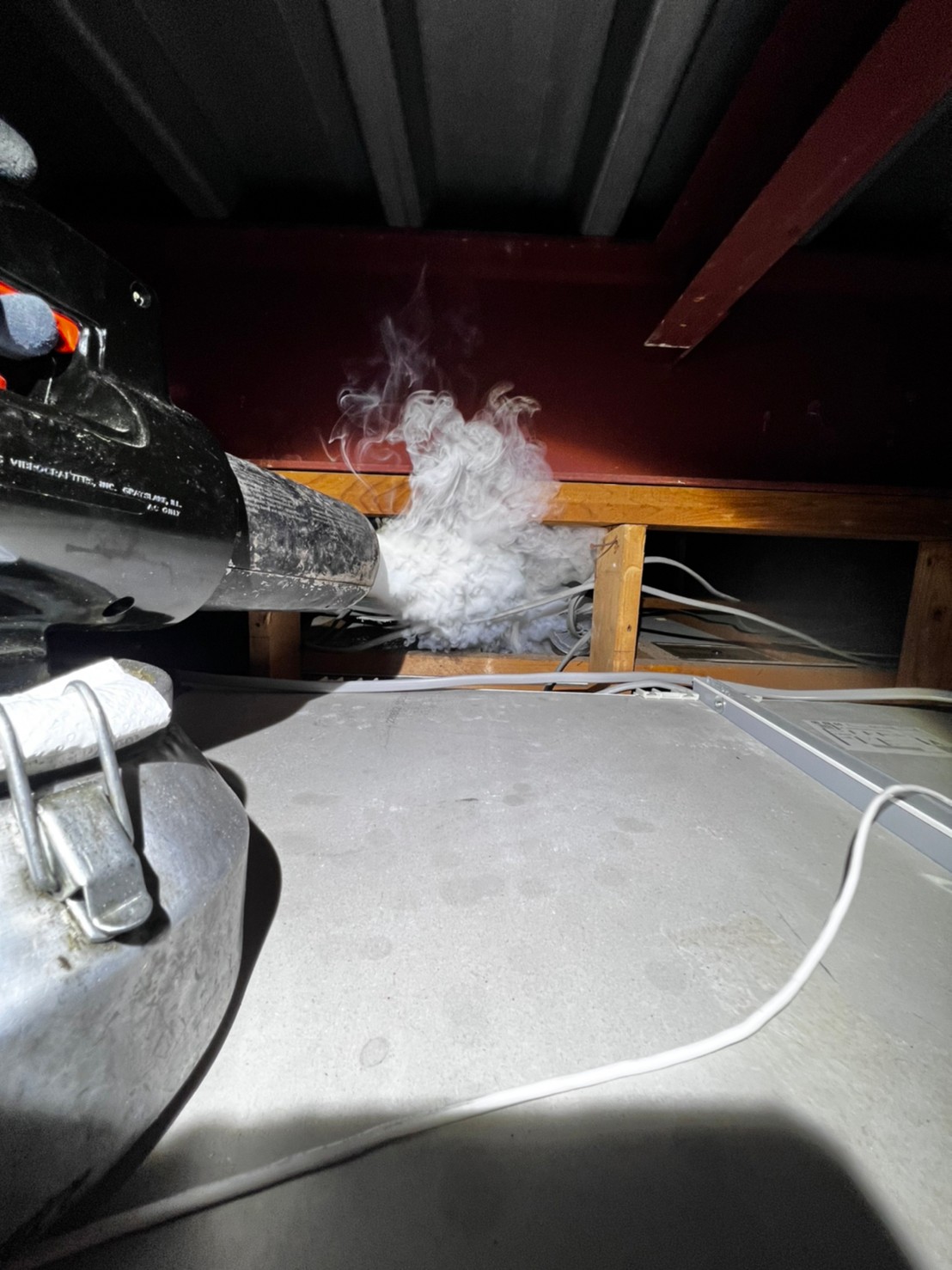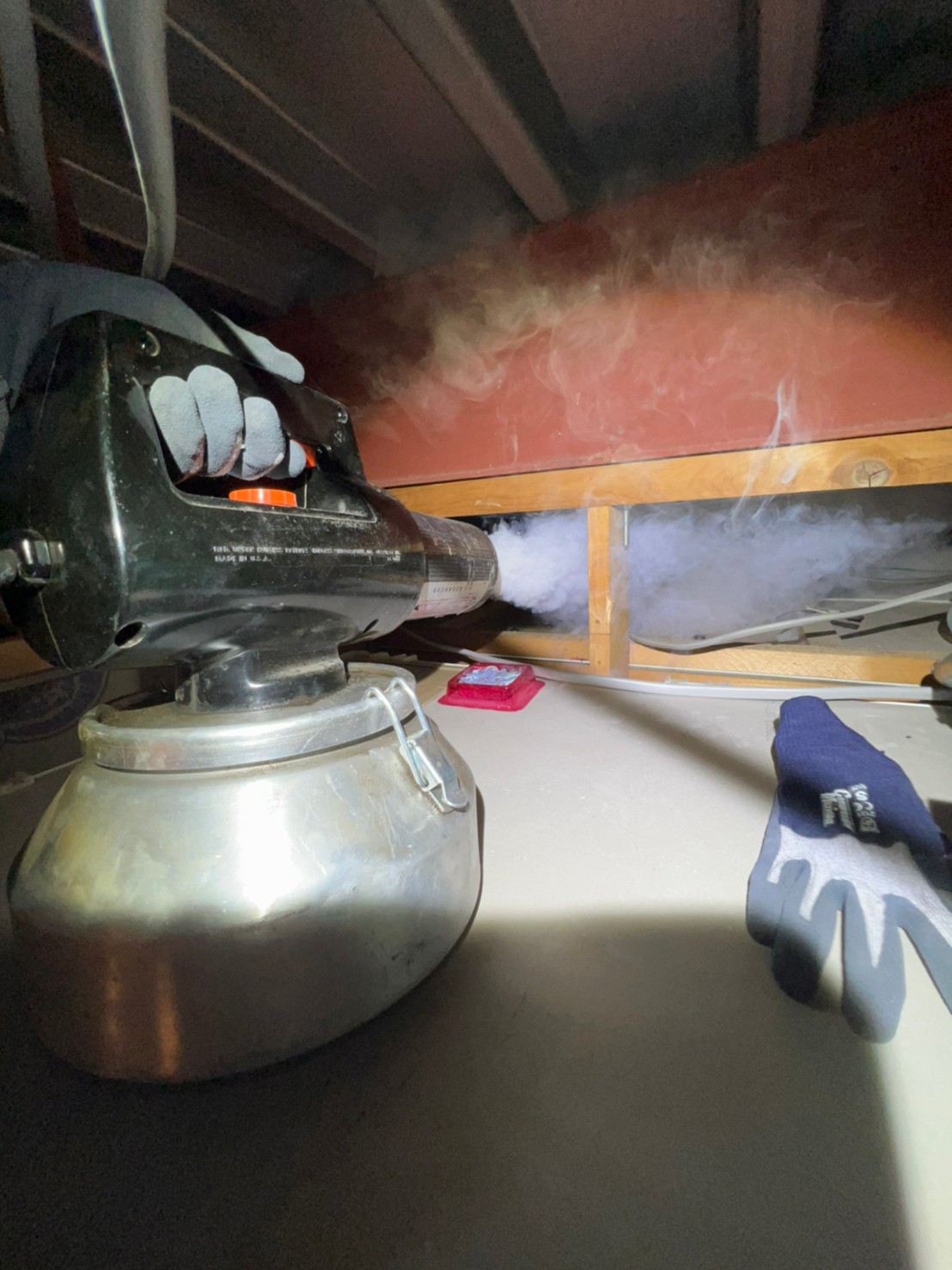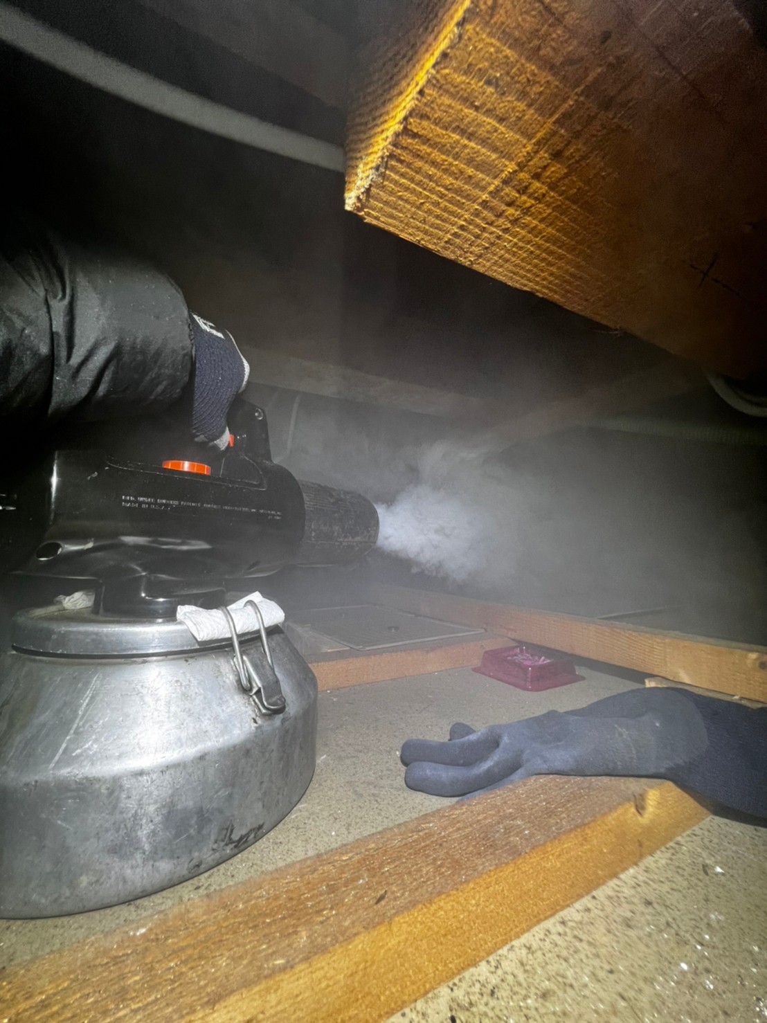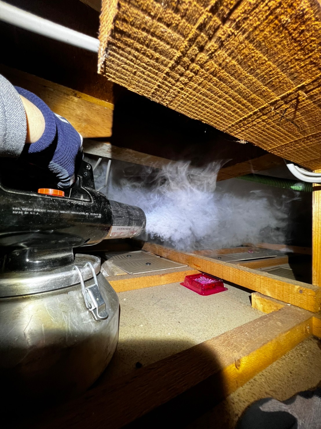 作業の初めに、ネズミの糞清掃や様々な作業を徹底して行えるように点検口を作成し、燻煙剤と呼ばれる薬剤を天井裏や床下に投入することで、ネズミを追い出していきます。