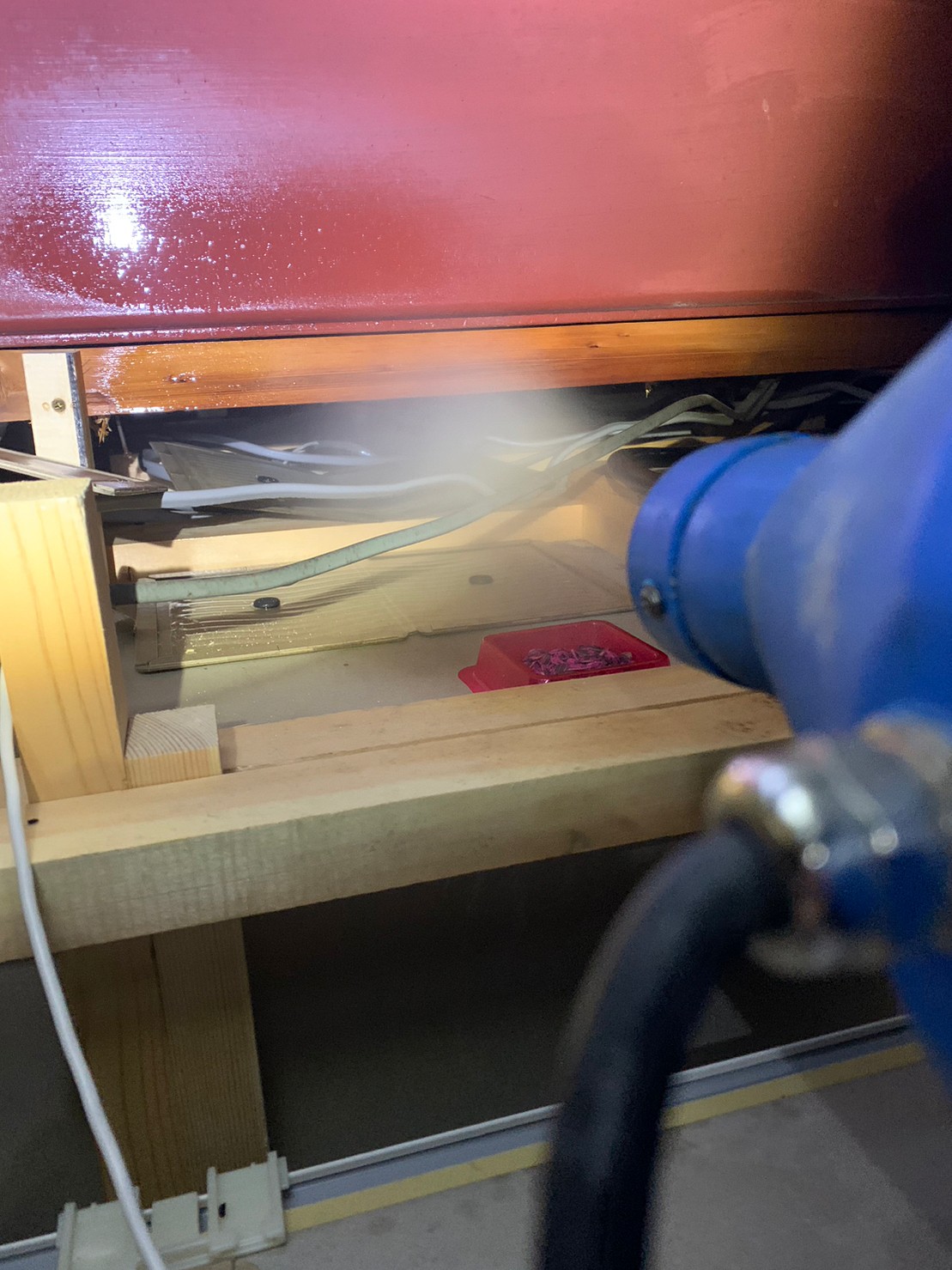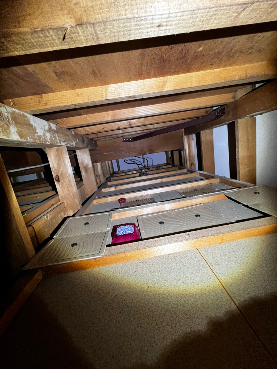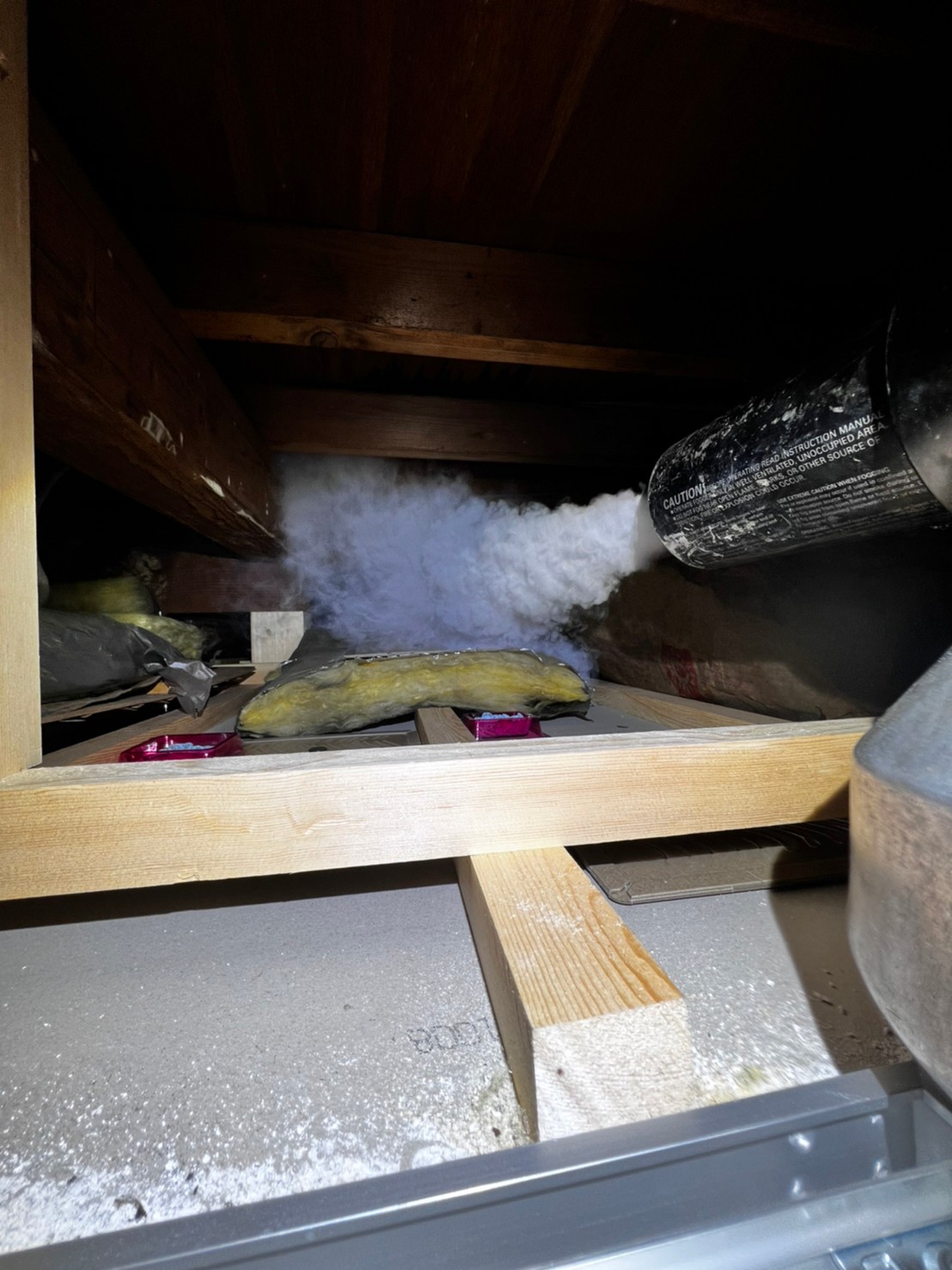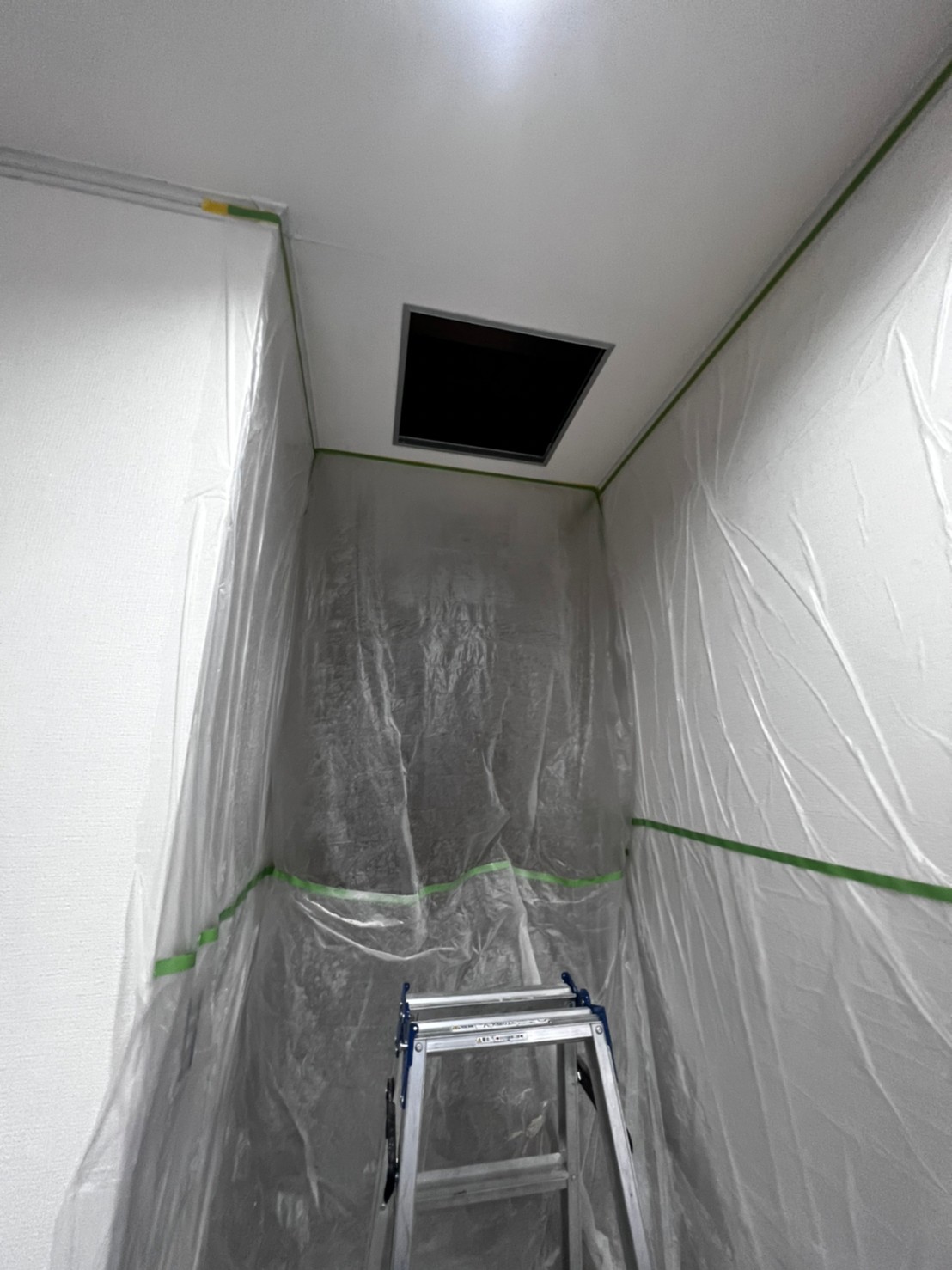 作業の初めに、ネズミの糞清掃や様々な作業を徹底して行えるように点検口を作成し、燻煙剤と呼ばれる薬剤を天井裏や床下に投入することで、ネズミを追い出していきます。